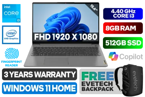 Lenovo IdeaPad 3 15IAU7 82RK00JWSA 12th Gen Intel Core i3-1215U up to 4.40GHz Processor, 10MB Cache, 6x Cores, 8x Threads / 8GB DDR4 RAM / 512GB Ultra-Fast NVME SSD / 15.6" FHD 1920x1080 Refresh-rate Anti-Glare Display / Integrated Intel UHD Graphics / No DVD Drive Included / Windows 11 Home (64bit) / HD 720p with Privacy Shutter Microphone / Bluetooth 5.0 / Intel® Wireless-AC 9560 / 2x 1.5W Speaker With Dolby Audio / Headphone Audio & Microphone Combo Jack / 2x USB Type-A / 1x USB Type-C / 1x HDMI / 1x SD Card Reader / White Backlit Keyboard / Fingerprint Reader / Supports battery Quick charge: approximately 80% in 1 Hour / Lenovo IdeaPad 3 15IAU7 Core i3 Laptop DealLenovo IdeaPad 3 15IAU7 82RK00JWSA 12th Gen Intel Core i3-1215U up to 4.40GHz Processor, 10MB Cache, 6x Cores, 8x Threads / 8GB DDR4 RAM / 512GB Ultra-Fast NVME SSD / 15.6" FHD 1920x1080 Refresh-rate Anti-Glare Display / Integrated Intel UHD Graphics / No DVD Drive Included / Windows 11 Home (64bit) / HD 720p with Privacy Shutter Microphone / Bluetooth 5.0 / Intel® Wireless-AC 9560 / 2x 1.5W Speaker With Dolby Audio / Headphone Audio & Microphone Combo Jack / 2x USB Type-A / 1x USB Type-C / 1x HDMI / 1x SD Card Reader / White Backlit Keyboard / Fingerprint Reader / Supports battery Quick charge: approximately 80% in 1 Hour / Lenovo IdeaPad 3 15IAU7 Core i3 Laptop Deal [82RK00JWSA] / 3 YEARS WARRANTY / [+] GET FREE EVETECH NEO Premium Gaming Backpack+ FREE DELIVERY !