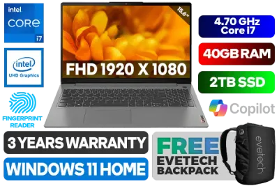 Lenovo IdeaPad 3 15IAU7 12th Gen Intel Core i7-1255U up to 4.70GHz Processor, 12MB Cache, 10x Cores, 12x Threads / 40GB DDR4 RAM / 2TB Ultra-Fast NVME SSD / 15.6" FHD 1920x1080 Anti-Glare Display / Integrated Intel UHD Graphics / No DVD Drive Included / Windows 11 Home (64bit) / HD 720p with Privacy Shutter Microphone / Bluetooth 5.1 / Realtek 8822CE Wi-Fi / 2x 1.5W Speaker With Dolby Audio / Headphone Audio & Microphone Combo Jack / 2x USB Type-A / 1x USB Type-C / 1x HDMI / 1x SD Card Reader / White Backlit Keyboard / Fingerprint Reader / Lenovo IdeaPad 3 15IAU7 Core i7 Laptop DealLenovo IdeaPad 3 15IAU7 12th Gen Intel Core i7-1255U up to 4.70GHz Processor, 12MB Cache, 10x Cores, 12x Threads / 40GB DDR4 RAM / 2TB Ultra-Fast NVME SSD / 15.6" FHD 1920x1080 Anti-Glare Display / Integrated Intel UHD Graphics / No DVD Drive Included / Windows 11 Home (64bit) / HD 720p with Privacy Shutter Microphone / Bluetooth 5.1 / Realtek 8822CE Wi-Fi / 2x 1.5W Speaker With Dolby Audio / Headphone Audio & Microphone Combo Jack / 2x USB Type-A / 1x USB Type-C / 1x HDMI / 1x SD Card Reader / White Backlit Keyboard / Fingerprint Reader / Lenovo IdeaPad 3 15IAU7 Core i7 Laptop Deal [82RK010BSA/40GB/2TB] / 3 YEARS WARRANTY / [+] GET FREE EVETECH NEO Premium Gaming Backpack+ FREE DELIVERY !