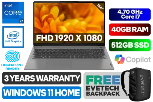 Lenovo IdeaPad 3 15IAU7 12th Gen Intel Core i7-1255U up to 4.70GHz Processor, 12MB Cache, 10x Cores, 12x Threads / 40GB DDR4 RAM / 512GB Ultra-Fast NVME SSD / 15.6" FHD 1920x1080 Anti-Glare Display / Integrated Intel UHD Graphics / No DVD Drive Included / Windows 11 Home (64bit) / HD 720p with Privacy Shutter Microphone / Bluetooth 5.1 / Realtek 8822CE Wi-Fi / 2x 1.5W Speaker With Dolby Audio / Headphone Audio & Microphone Combo Jack / 2x USB Type-A / 1x USB Type-C / 1x HDMI / 1x SD Card Reader / White Backlit Keyboard / Fingerprint Reader / Lenovo IdeaPad 3 15IAU7 Core i7 Laptop DealLenovo IdeaPad 3 15IAU7 12th Gen Intel Core i7-1255U up to 4.70GHz Processor, 12MB Cache, 10x Cores, 12x Threads / 40GB DDR4 RAM / 512GB Ultra-Fast NVME SSD / 15.6" FHD 1920x1080 Anti-Glare Display / Integrated Intel UHD Graphics / No DVD Drive Included / Windows 11 Home (64bit) / HD 720p with Privacy Shutter Microphone / Bluetooth 5.1 / Realtek 8822CE Wi-Fi / 2x 1.5W Speaker With Dolby Audio / Headphone Audio & Microphone Combo Jack / 2x USB Type-A / 1x USB Type-C / 1x HDMI / 1x SD Card Reader / White Backlit Keyboard / Fingerprint Reader / Lenovo IdeaPad 3 15IAU7 Core i7 Laptop Deal [82RK010BSA/40GB] / 3 YEARS WARRANTY / [+] GET FREE EVETECH NEO Premium Gaming Backpack+ FREE DELIVERY !