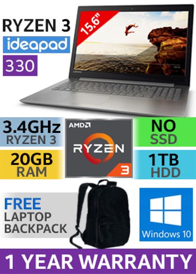 Lenovo Ideapad 330 330-ABR AMD Ryzen 3 2200U up to 3.40GHz 4MB Cache Processor, 4x Threads / 20GB DDR4 RAM / 1TB Hard Drive / 15.6" HD 1366 x 768 Anti-Glare Display / Integrated AMD Radeon™ Vega 3 Graphics, DirectX 12 Support / No DVD Drive Included / Windows 10 Home (64bit) / Web camera With Mic / Bluetooth 4.1 / 802.11ac Wireless LAN / 2x 1.5W Speaker With Dolby Audio / 2 x USB 3.0 / 1 x HDMI / 1 x USB 3.1 Type C / 4-in-1 card reader (SD, SDHC, SDXC, MMC) / 1 Years Carry In Warranty / FREE Backpack / AMD Ryzen 3 Laptop DealLenovo Ideapad 330 330-ABR AMD Ryzen 3 2200U up to 3.40GHz 4MB Cache Processor, 4x Threads / 20GB DDR4 RAM / 1TB Hard Drive / 15.6" HD 1366 x 768 Anti-Glare Display / Integrated AMD Radeon™ Vega 3 Graphics, DirectX 12 Support / No DVD Drive Included / Windows 10 Home (64bit) / Web camera With Mic / Bluetooth 4.1 / 802.11ac Wireless LAN / 2x 1.5W Speaker With Dolby Audio / 2 x USB 3.0 / 1 x HDMI / 1 x USB 3.1 Type C / 4-in-1 card reader (SD, SDHC, SDXC, MMC) / 1 Years Carry In Warranty / FREE Backpack / AMD Ryzen 3 Laptop Deal [81D2006FSA/20GB] + FREE DELIVERY !