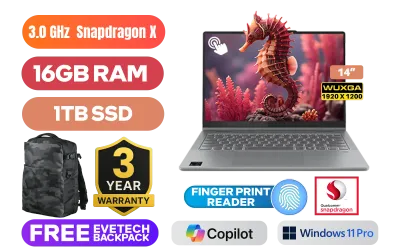 [TOUCHSCREEN] Lenovo IdeaPad 5 14Q8X9 Snapdragon X X1-26-100 up to 3.0GHz Processor, 30MB Cache, 8x Cores / 16GB LPDDR5x RAM / 1TB Ultra-Fast NVME SSD / 14" WUXGA 1920x1200 OLED-Level 60Hz Touchscreen Display / Integrated Qualcomm® Adreno™ x1-45 Graphics / <span style="font-size: 20px; color: #00BFFF; font-weight: bold;">Windows 11 Professional (64bit)</span> / Qualcomm® FastConnect™ 7800 Wireless LAN / Bluetooth 5.4 / FHD 1080p with Privacy Shutter Camera / Fingerprint Reader / 2x USB Type-A / 2x USB Type-C with (USB PD 3.0 and DisplayPort™ 1.4) / 1x HDMI / 1x microSD Card Reader / 1x Headphone and Microphone Audio Combo Jack / FREE Lenovo Digital Pen 2 / Lenovo IdeaPad 5 14Q8X9 Snapdragon X Touchscreen Laptop Deal[TOUCHSCREEN] Lenovo IdeaPad 5 14Q8X9 Snapdragon X X1-26-100 up to 3.0GHz Processor, 30MB Cache, 8x Cores / 16GB LPDDR5x RAM / 1TB Ultra-Fast NVME SSD / 14" WUXGA 1920x1200 OLED-Level 60Hz Touchscreen Display / Integrated Qualcomm® Adreno™ x1-45 Graphics / Windows 11 Professional (64bit) / Qualcomm® FastConnect™ 7800 Wireless LAN / Bluetooth 5.4 / FHD 1080p with Privacy Shutter Camera / Fingerprint Reader / 2x USB Type-A / 2x USB Type-C with (USB PD 3.0 and DisplayPort™ 1.4) / 1x HDMI / 1x microSD Card Reader / 1x Headphone and Microphone Audio Combo Jack / FREE Lenovo Digital Pen 2 / Lenovo IdeaPad 5 14Q8X9 Snapdragon X Touchscreen Laptop Deal [83GH003CSA] / 3 YEARS WARRANTY / [+] GET FREE EVETECH DASH Premium Gaming Backpack+ FREE DELIVERY !