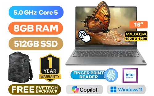 [TOUCHSCREEN] Lenovo IdeaPad 5 2-in-1 16IRU9 Intel® Core™ 5-120U Up to 5.0GHz Processor, 12MB Cache, 10x Cores, 12x Threads / 8GB LPDDR5 RAM / 512GB Ultra-Fast NVME SSD / 16" WUXGA (1920 x 1200) IPS, Touchscreen Display / Integrated Intel® Graphics / Windows 11 Home (64bit) / 1080P FHD Camera with Privacy Shutter / Realtek RTL8852BE Wi-Fi 6 Wireless LAN / Bluetooth 5.2 / 2x Stereo speakers optimized with Dolby Audio™ / 2x USB Type-A / 2x USB Type-C / 1x HDMI / 1x MicroSD Card / 1x Headphone and Microphone Combo Jack / Fingerprint Reader / White Backlit keyboard / Lenovo® Digital Pen 2 / 1 Year Warranty / Lenovo IdeaPad 5 2-in-1 16IRU9 Intel® Core™ 5 Laptop Deal[TOUCHSCREEN] Lenovo IdeaPad 5 2-in-1 16IRU9 Intel® Core™ 5-120U Up to 5.0GHz Processor, 12MB Cache, 10x Cores, 12x Threads / 8GB LPDDR5 RAM / 512GB Ultra-Fast NVME SSD / 16" WUXGA (1920 x 1200) IPS, Touchscreen Display / Integrated Intel® Graphics / Windows 11 Home (64bit) / 1080P FHD Camera with Privacy Shutter / Realtek RTL8852BE Wi-Fi 6 Wireless LAN / Bluetooth 5.2 / 2x Stereo speakers optimized with Dolby Audio™ / 2x USB Type-A / 2x USB Type-C / 1x HDMI / 1x MicroSD Card / 1x Headphone and Microphone Combo Jack / Fingerprint Reader / White Backlit keyboard / Lenovo® Digital Pen 2 / 1 Year Warranty / Lenovo IdeaPad 5 2-in-1 16IRU9 Intel® Core™ 5 Laptop Deal [83DU0049FU] / [+] GET FREE EVETECH DASH Premium Gaming Backpack+ FREE DELIVERY !