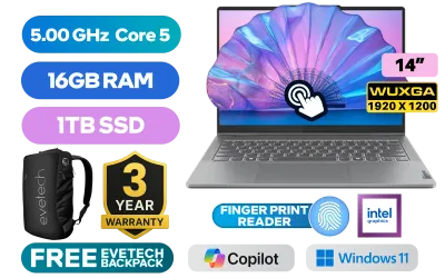 [TOUCHSCREEN] Lenovo IdeaPad 5 2-in-1 14IRU9 Intel® Core™ 5-120U up to 5.00GHz Processor, 12MB Cache, 10x Cores, 12x Threads / 16GB LPDDR5X RAM / 1TB Ultra-Fast NVME SSD / 14" WUXGA (1920 x 1200) IPS-Level Display With Multi-Touch Screen / Integrated Intel Graphics / Windows 11 Home (64bit) / 1080p FHD Camera with Privacy Shutter / Bluetooth 5.3 / Intel Wi-Fi 6 AX211 Wireless LAN / Fingerprint Reader / 2x 2W Speaker With Dolby Audio / Headphone Audio & Microphone Combo Jack / 2x USB Type-A / 2x USB Type-C / 1x HDMI / 1x microSD Card Reader / White Backlit keyboard / Lenovo® Digital Pen 2 / Lenovo IdeaPad 5 2-in-1 14IRU9 Core 5 Touchscreen Laptop Deal[TOUCHSCREEN] Lenovo IdeaPad 5 2-in-1 14IRU9 Intel® Core™ 5-120U up to 5.00GHz Processor, 12MB Cache, 10x Cores, 12x Threads / 16GB LPDDR5X RAM / 1TB Ultra-Fast NVME SSD / 14" WUXGA (1920 x 1200) IPS-Level Display With Multi-Touch Screen / Integrated Intel Graphics / Windows 11 Home (64bit) / 1080p FHD Camera with Privacy Shutter / Bluetooth 5.3 / Intel Wi-Fi 6 AX211 Wireless LAN / Fingerprint Reader / 2x 2W Speaker With Dolby Audio / Headphone Audio & Microphone Combo Jack / 2x USB Type-A / 2x USB Type-C / 1x HDMI / 1x microSD Card Reader / White Backlit keyboard / Lenovo® Digital Pen 2 / Lenovo IdeaPad 5 2-in-1 14IRU9 Core 5 Touchscreen Laptop Deal [83DT0054SA/1TB] / [+] GET FREE EVETECH NEO Premium Gaming Backpack / 3 YEARS WARRANTY + FREE DELIVERY !