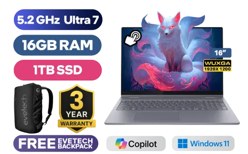 [TOUCHSCREEN] Lenovo IdeaPad Flex 5 2-in-1 16IAL10 Intel Core Ultra 7-255U up to 5.2GHz Processor, 12MB Cache, 12x Cores, 14x Threads / 16GB LPDDR5X RAM / 1TB Ultra-Fast NVME SSD / 16" WUXGA (1920x1200) IPS-Level Touchscreen Display / Integrated Intel Graphics / Windows 11 Home (64bit) / MediaTek WiFi 7 MT7925 Wireless LAN / Bluetooth 5.4 / FHD IR Camera with Privacy Shutter / 2x USB Type-A / 2x USB Type-C (Supports DisplayPort 1.4 / Power Delivery) / 1x HDMI / 1x Mirco SD card reader / 1x Headphone & Microphone Combo Jack / White Backlit Keyboard / 2 Stereo Speakers Optimized with Dolby Atmos Audio / Free Lenovo Digital Pen / Lenovo IdeaPad Flex 5 16IAL10 Core Ultra 7 Laptop Deal[TOUCHSCREEN] Lenovo IdeaPad Flex 5 2-in-1 16IAL10 Intel Core Ultra 7-255U up to 5.2GHz Processor, 12MB Cache, 12x Cores, 14x Threads / 16GB LPDDR5X RAM / 1TB Ultra-Fast NVME SSD / 16" WUXGA (1920x1200) IPS-Level Touchscreen Display / Integrated Intel Graphics / Windows 11 Home (64bit) / MediaTek WiFi 7 MT7925 Wireless LAN / Bluetooth 5.4 / FHD IR Camera with Privacy Shutter / 2x USB Type-A / 2x USB Type-C (Supports DisplayPort 1.4 / Power Delivery) / 1x HDMI / 1x Mirco SD card reader / 1x Headphone & Microphone Combo Jack / White Backlit Keyboard / 2 Stereo Speakers Optimized with Dolby Atmos Audio / Free Lenovo Digital Pen / Lenovo IdeaPad Flex 5 16IAL10 Core Ultra 7 Laptop Deal [83KS003LSA] / [+] GET FREE EVETECH NEO Premium Gaming Backpack / 3 YEARS WARRANTY + FREE DELIVERY !
