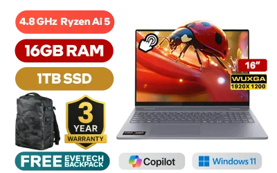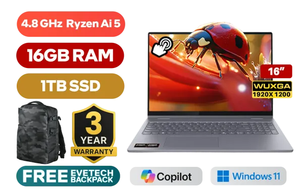 [TOUCHSCREEN] Lenovo IdeaPad Flex 5 2-in-1 16AKP10 AMD Ryzen AI 5-340 up to 4.8GHz Processor, 22MB Cache, 6x Cores, 12x Threads / 16GB LPDDR5X RAM / 1TB Ultra-Fast NVME SSD / 16" WUXGA (1920x1200) IPS-Level Touchscreen Display / Integrated AMD Radeon Graphics / Windows 11 Home (64bit) / MediaTek WiFi 7 MT7925 Wireless LAN / Bluetooth 5.4 / 1080p FHD IR Camera with Privacy Shutter / 2x USB Type-A / 2x USB Type-C (DisplayPort 1.4 / Power Delivery) / 1x HDMI / 1x Micro SD card reader / 1x Headphone & Microphone Combo Jack / White Backlit Keyboard / 2 Stereo Speakers Optimized with Dolby Atmos Audio / Free Lenovo Digital Pen 2 / Lenovo IdeaPad Flex 5 16AKP10 Ryzen AI 5 Touchscreen Laptop Deal[TOUCHSCREEN] Lenovo IdeaPad Flex 5 2-in-1 16AKP10 AMD Ryzen AI 5-340 up to 4.8GHz Processor, 22MB Cache, 6x Cores, 12x Threads / 16GB LPDDR5X RAM / 1TB Ultra-Fast NVME SSD / 16" WUXGA (1920x1200) IPS-Level Touchscreen Display / Integrated AMD Radeon Graphics / Windows 11 Home (64bit) / MediaTek WiFi 7 MT7925 Wireless LAN / Bluetooth 5.4 / 1080p FHD IR Camera with Privacy Shutter / 2x USB Type-A / 2x USB Type-C (DisplayPort 1.4 / Power Delivery) / 1x HDMI / 1x Micro SD card reader / 1x Headphone & Microphone Combo Jack / White Backlit Keyboard / 2 Stereo Speakers Optimized with Dolby Atmos Audio / Free Lenovo Digital Pen 2 / Lenovo IdeaPad Flex 5 16AKP10 Ryzen AI 5 Touchscreen Laptop Deal [83KU0036SA] + FREE DELIVERY !