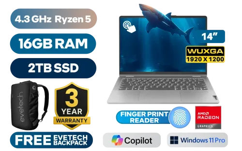[TOUCHSCREEN] Lenovo IdeaPad Flex 5 AMD Ryzen 5 5625U up to 4.3GHz Processor with AMD Max Boost Clock Technology, 16MB Cache, 6x Cores, 12x Threads / 16GB LPDDR4X RAM / 2TB Ultra-Fast NVME SSD / 14" WUXGA (1920x1200) IPS-Level Touchscreen Display / Integrated AMD Radeon Graphics / <span style="font-size: 20px; color: #00BFFF; font-weight: bold;">Windows 11 Professional (64bit)</span> / 1080p FHD Camera with Privacy Shutter / Realtek RTL 8852BE Wi-Fi 6 Wireless LAN / Bluetooth 5.3 / Fingerprint Reader / 2x USB Type-A / 1x USB Type-C / 1x HDMI / 1x SD card reader / 1x Headphone Audio & Microphone Combo Jack / White Backlit Keyboard / Realtek ALC3287 Audio Technology / Free Lenovo Digital Pen / Lenovo IdeaPad Flex 5 14ABR8 AMD Ryzen 5 Touchscreen Laptop Deal[TOUCHSCREEN] Lenovo IdeaPad Flex 5 AMD Ryzen 5 5625U up to 4.3GHz Processor with AMD Max Boost Clock Technology, 16MB Cache, 6x Cores, 12x Threads / 16GB LPDDR4X RAM / 2TB Ultra-Fast NVME SSD / 14" WUXGA (1920x1200) IPS-Level Touchscreen Display / Integrated AMD Radeon Graphics / Windows 11 Professional (64bit) / 1080p FHD Camera with Privacy Shutter / Realtek RTL 8852BE Wi-Fi 6 Wireless LAN / Bluetooth 5.3 / Fingerprint Reader / 2x USB Type-A / 1x USB Type-C / 1x HDMI / 1x SD card reader / 1x Headphone Audio & Microphone Combo Jack / White Backlit Keyboard / Realtek ALC3287 Audio Technology / Free Lenovo Digital Pen / Lenovo IdeaPad Flex 5 14ABR8 AMD Ryzen 5 Touchscreen Laptop Deal [82XX00G1SA/2TB] / 3 YEARS WARRANTY / [+] GET FREE EVETECH NEO Premium Gaming Backpack+ FREE DELIVERY !