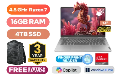 [TOUCHSCREEN] Lenovo IdeaPad Flex 5 14ABR8 AMD Ryzen 7 5825U up to 4.5GHz Processor with AMD Max Boost Clock Technology, 20MB Cache, 8x Cores, 16x Threads / 16GB LPDDR4X RAM / 4TB Ultra-Fast NVME SSD / 14" WUXGA (1920x1200) IPS-Level Touchscreen Display / Integrated AMD Radeon Graphics / <span style="font-size: 20px; color: #00BFFF; font-weight: bold;">Windows 11 Professional (64bit)</span> / 1080p FHD Camera with Privacy Shutter / Realtek RTL 8852BE Wi-Fi 6 Wireless LAN / Bluetooth 5.3 / Fingerprint Reader / 2x USB Type-A / 1x USB Type-C / 1x HDMI / 1x SD card reader / 1x Headphone Audio & Microphone Combo Jack / Realtek ALC3287 Audio / Free Lenovo Digital Pen / Lenovo IdeaPad Flex 5 14ABR8 AMD Ryzen 7 Touchscreen Laptop Deal[TOUCHSCREEN] Lenovo IdeaPad Flex 5 14ABR8 AMD Ryzen 7 5825U up to 4.5GHz Processor with AMD Max Boost Clock Technology, 20MB Cache, 8x Cores, 16x Threads / 16GB LPDDR4X RAM / 4TB Ultra-Fast NVME SSD / 14" WUXGA (1920x1200) IPS-Level Touchscreen Display / Integrated AMD Radeon Graphics / Windows 11 Professional (64bit) / 1080p FHD Camera with Privacy Shutter / Realtek RTL 8852BE Wi-Fi 6 Wireless LAN / Bluetooth 5.3 / Fingerprint Reader / 2x USB Type-A / 1x USB Type-C / 1x HDMI / 1x SD card reader / 1x Headphone Audio & Microphone Combo Jack / Realtek ALC3287 Audio / Free Lenovo Digital Pen / Lenovo IdeaPad Flex 5 14ABR8 AMD Ryzen 7 Touchscreen Laptop Deal [82XX00G2SA/4TB] / 3 YEARS WARRANTY / [+] GET FREE EVETECH DASH Premium Gaming Backpack+ FREE DELIVERY !