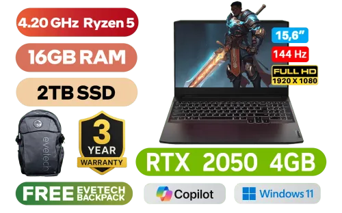 Lenovo IdeaPad Gaming 3 15ACH6 AMD Ryzen 5 5500H up to 4.20GHz Processor, 8MB Cache, 4x Cores, 8x Threads / 16GB DDR4 RAM / 2TB Ultra-Fast NVMe SSD / 15.6" FHD 1920 x 1080 Anti-Glare 144Hz IPS-Level Display / NVIDIA GeForce RTX 2050 4GB GDDR6 Dedicated Graphics / No DVD Drive Included / Windows 11 Home (64bit)</span> / HD 720p Webcam With Dual Array Mic / Bluetooth 5.1 / MediaTek Wifi 6 MT7921 Wireless LAN / 2x USB 3.2 Type-A / 1x USB 3.2 Type-C / 1x HDMI 2.0 / Headphone Audio & Microphone Combo Jack / 1x RJ-45 Ethernet Port / 2x 2W Speaker With Nahimic Audio / White Backlit full-size Keyboard / Lenovo IdeaPad Gaming 3 15ACH6 Ryzen 5 RTX 2050 Laptop DealLenovo IdeaPad Gaming 3 15ACH6 AMD Ryzen 5 5500H up to 4.20GHz Processor, 8MB Cache, 4x Cores, 8x Threads / 16GB DDR4 RAM / 2TB Ultra-Fast NVMe SSD / 15.6" FHD 1920 x 1080 Anti-Glare 144Hz IPS-Level Display / NVIDIA GeForce RTX 2050 4GB GDDR6 Dedicated Graphics / No DVD Drive Included / Windows 11 Home (64bit) / HD 720p Webcam With Dual Array Mic / Bluetooth 5.1 / MediaTek Wifi 6 MT7921 Wireless LAN / 2x USB 3.2 Type-A / 1x USB 3.2 Type-C / 1x HDMI 2.0 / Headphone Audio & Microphone Combo Jack / 1x RJ-45 Ethernet Port / 2x 2W Speaker With Nahimic Audio / White Backlit full-size Keyboard / Lenovo IdeaPad Gaming 3 15ACH6 Ryzen 5 RTX 2050 Laptop Deal [82K202D8SA/16GB/2TB] / 3 YEARS WARRANTY / [+] GET FREE EVETECH FLUX Premium Gaming Backpack+ FREE DELIVERY !