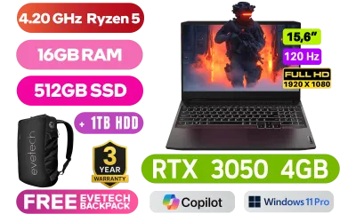 Lenovo IdeaPad Gaming 3 15ACH6 82K200U2SA AMD Ryzen 5 5600H up to 4.20GHz Processor, 16MB Cache, 6x Cores, 12x Threads / 16GB DDR4 RAM / 512GB Ultra-Fast NVMe SSD + 1TB Hard Drive / 15.6" FHD 1920 x 1080 Anti-Glare 120Hz IPS-Level Display / NVIDIA GeForce RTX 3050 4GB GDDR6 Dedicated Graphics / No DVD Drive Included / <span style="font-size: 20px; color: #00BFFF; font-weight: bold;">Windows 11 Professional (64bit)</span> / HD 720p Webcam With Dual Array Mic / Bluetooth 5.0 / Dual Band WiFi 6 802.11ax Wireless LAN / 2x USB 3.2 Type-A / 1x USB 3.2 Type-C / 1x HDMI 2.0 / Headphone Audio & Microphone Combo Jack / 2x 2W Speaker With Nahimic Audio / White Backlit full-size Keyboard / supports Rapid Charge (1 hour 80%) / Lenovo IdeaPad Gaming 3 15ACH6 Ryzen 5 RTX 3050 Laptop DealLenovo IdeaPad Gaming 3 15ACH6 82K200U2SA AMD Ryzen 5 5600H up to 4.20GHz Processor, 16MB Cache, 6x Cores, 12x Threads / 16GB DDR4 RAM / 512GB Ultra-Fast NVMe SSD + 1TB Hard Drive / 15.6" FHD 1920 x 1080 Anti-Glare 120Hz IPS-Level Display / NVIDIA GeForce RTX 3050 4GB GDDR6 Dedicated Graphics / No DVD Drive Included / Windows 11 Professional (64bit) / HD 720p Webcam With Dual Array Mic / Bluetooth 5.0 / Dual Band WiFi 6 802.11ax Wireless LAN / 2x USB 3.2 Type-A / 1x USB 3.2 Type-C / 1x HDMI 2.0 / Headphone Audio & Microphone Combo Jack / 2x 2W Speaker With Nahimic Audio / White Backlit full-size Keyboard / supports Rapid Charge (1 hour 80%) / Lenovo IdeaPad Gaming 3 15ACH6 Ryzen 5 RTX 3050 Laptop Deal [82K200U2SA/16GB/512GB] / 3 YEARS WARRANTY / [+] GET FREE EVETECH NEO Premium Gaming Backpack+ FREE DELIVERY !