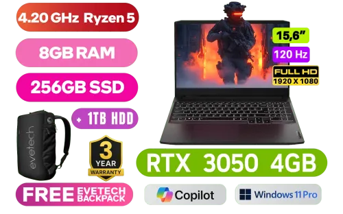 Lenovo IdeaPad Gaming 3 15ACH6 82K200U2SA AMD Ryzen 5 5600H up to 4.20GHz Processor, 16MB Cache, 6x Cores, 12x Threads / 8GB DDR4 RAM / 256GB Ultra-Fast NVMe SSD + 1TB Hard Drive / 15.6" FHD 1920 x 1080 Anti-Glare 120Hz IPS-Level Display / NVIDIA GeForce RTX 3050 4GB GDDR6 Dedicated Graphics / No DVD Drive Included / <span style="font-size: 20px; color: #00BFFF; font-weight: bold;">Windows 11 Professional (64bit)</span> / HD 720p Webcam With Dual Array Mic / Bluetooth 5.0 / Dual Band WiFi 6 802.11ax Wireless LAN / 2x USB 3.2 Type-A / 1x USB 3.2 Type-C / 1x HDMI 2.0 / Headphone Audio & Microphone Combo Jack / 2x 2W Speaker With Nahimic Audio / White Backlit full-size Keyboard / supports Rapid Charge (1 hour 80%) / Lenovo IdeaPad Gaming 3 15ACH6 Ryzen 5 RTX 3050 Laptop DealLenovo IdeaPad Gaming 3 15ACH6 82K200U2SA AMD Ryzen 5 5600H up to 4.20GHz Processor, 16MB Cache, 6x Cores, 12x Threads / 8GB DDR4 RAM / 256GB Ultra-Fast NVMe SSD + 1TB Hard Drive / 15.6" FHD 1920 x 1080 Anti-Glare 120Hz IPS-Level Display / NVIDIA GeForce RTX 3050 4GB GDDR6 Dedicated Graphics / No DVD Drive Included / Windows 11 Professional (64bit) / HD 720p Webcam With Dual Array Mic / Bluetooth 5.0 / Dual Band WiFi 6 802.11ax Wireless LAN / 2x USB 3.2 Type-A / 1x USB 3.2 Type-C / 1x HDMI 2.0 / Headphone Audio & Microphone Combo Jack / 2x 2W Speaker With Nahimic Audio / White Backlit full-size Keyboard / supports Rapid Charge (1 hour 80%) / Lenovo IdeaPad Gaming 3 15ACH6 Ryzen 5 RTX 3050 Laptop Deal [82K200U2SA] / 3 YEARS WARRANTY / [+] GET FREE EVETECH NEO Premium Gaming Backpack+ FREE DELIVERY !