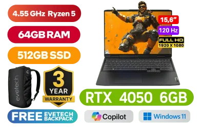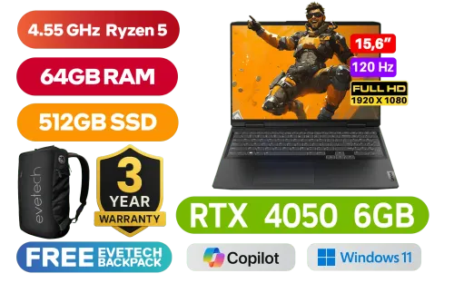 Lenovo IdeaPad Gaming 3 15ARH7 82SB00P8FU AMD Ryzen™ 5 7535HS up to 4.55GHz Processor with AMD Max Boost Clock Technology, 19MB Cache, 6x Cores, 12x Threads / 64GB DDR5 RAM / 512GB Ultra-Fast NVMe SSD / 15.6" FHD 1920 x 1080 Anti-Glare 120Hz IPS-Level Display / NVIDIA GeForce RTX 4050 6GB GDDR6 Dedicated Graphics / No DVD Drive Included / Windows 11 Home (64bit) / HD 720p Webcam With Dual Array Mic / Bluetooth 5.1 / WiFi 6 Wireless LAN / 2x USB 3.2 Type-A / 1x USB 3.2 Type-C / 1x HDMI 2.0 / 1x RJ45 / Headphone Audio & Microphone Combo Jack / 2x 2W Speaker With Nahimic Audio / White Backlit full-size Keyboard / Lenovo IdeaPad Gaming 3 15ARH7 Ryzen 5 RTX 4050 Laptop DealLenovo IdeaPad Gaming 3 15ARH7 82SB00P8FU AMD Ryzen™ 5 7535HS up to 4.55GHz Processor with AMD Max Boost Clock Technology, 19MB Cache, 6x Cores, 12x Threads / 64GB DDR5 RAM / 512GB Ultra-Fast NVMe SSD / 15.6" FHD 1920 x 1080 Anti-Glare 120Hz IPS-Level Display / NVIDIA GeForce RTX 4050 6GB GDDR6 Dedicated Graphics / No DVD Drive Included / Windows 11 Home (64bit) / HD 720p Webcam With Dual Array Mic / Bluetooth 5.1 / WiFi 6 Wireless LAN / 2x USB 3.2 Type-A / 1x USB 3.2 Type-C / 1x HDMI 2.0 / 1x RJ45 / Headphone Audio & Microphone Combo Jack / 2x 2W Speaker With Nahimic Audio / White Backlit full-size Keyboard / Lenovo IdeaPad Gaming 3 15ARH7 Ryzen 5 RTX 4050 Laptop Deal [82SB00P8FU/64GB] / 3 YEARS WARRANTY / [+] GET FREE EVETECH NEO Premium Gaming Backpack+ FREE DELIVERY !