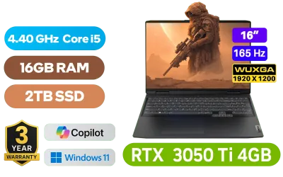 Lenovo IdeaPad Gaming 3 16IAH7 82SA00GMFU 12th Gen Intel Core i5-12450H up to 4.40GHz Processor, 12MB Cache, 8x Cores, 12x Threads / 16GB DDR4 RAM / 2TB Ultra-Fast NVMe SSD / 16" WUXGA 1920 x 1200 Anti-Glare 165Hz IPS-Level Display / NVIDIA 30 Series GeForce RTX 3050 Ti 4GB GDDR6 Dedicated Graphics / Windows 11 Home (64bit) / FHD 1080p with Privacy Shutter Webcam With Dual Array Mic / Bluetooth 5.1 / Realtek RTL8852BE Wifi 6 Wireless LAN / 2x USB 3.2 Type-A / 1x USB 3.2 Type-C (support data transfer, Power Delivery 3.0 and DisplayPort™ 1.4) / 1x HDMI / 1x RJ-45 / Headphone Audio & Microphone Combo Jack / 2x 2W Speaker With Nahimic Audio / White Backlit full-size Keyboard / supports Rapid Charge Boost (get 2 hours of runtime with a 15-minute charge) / FREE Lenovo M100 RGB Gaming Mouse / Lenovo IdeaPad Gaming 3 16IAH7 Core i5 RTX 3050 Ti Gaming Laptop DealLenovo IdeaPad Gaming 3 16IAH7 82SA00GMFU 12th Gen Intel Core i5-12450H up to 4.40GHz Processor, 12MB Cache, 8x Cores, 12x Threads / 16GB DDR4 RAM / 2TB Ultra-Fast NVMe SSD / 16" WUXGA 1920 x 1200 Anti-Glare 165Hz IPS-Level Display / NVIDIA 30 Series GeForce RTX 3050 Ti 4GB GDDR6 Dedicated Graphics / Windows 11 Home (64bit) / FHD 1080p with Privacy Shutter Webcam With Dual Array Mic / Bluetooth 5.1 / Realtek RTL8852BE Wifi 6 Wireless LAN / 2x USB 3.2 Type-A / 1x USB 3.2 Type-C (support data transfer, Power Delivery 3.0 and DisplayPort™ 1.4) / 1x HDMI / 1x RJ-45 / Headphone Audio & Microphone Combo Jack / 2x 2W Speaker With Nahimic Audio / White Backlit full-size Keyboard / supports Rapid Charge Boost (get 2 hours of runtime with a 15-minute charge) / FREE Lenovo M100 RGB Gaming Mouse / Lenovo IdeaPad Gaming 3 16IAH7 Core i5 RTX 3050 Ti Gaming Laptop Deal [82SA00GMFU/16GB/2TB] / 3 YEARS WARRANTY + FREE DELIVERY !
