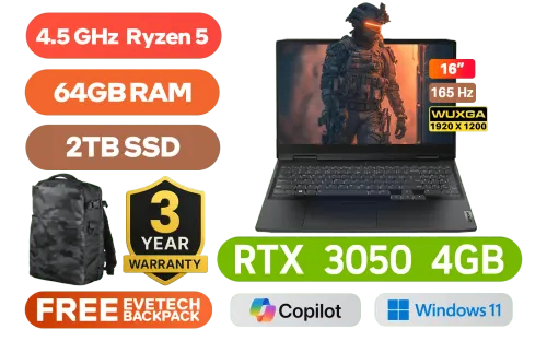 Lenovo IdeaPad Gaming 3 16ARH7 82SC00ABFU AMD Ryzen™ 5 6600H up to 4.5GHz Processor with AMD Max Boost Clock Technology, 19MB Cache, 6x Cores, 12x Threads / 64GB DDR5 RAM / 2TB Ultra-Fast NVMe SSD / 16" WUXGA 1920 x 1200 IPS 165Hz Anti-glare Display / NVIDIA GeForce RTX 3050 4GB GDDR6 Dedicated Graphics / No DVD Drive Included / Windows 11 Home (64bit) / FHD 1080p with Privacy Shutter web Camera / Bluetooth 5.1 / Wi-Fi 6 11ax Wireless LAN / 2x USB 3.2 Type-A / 1x USB 3.2 Type-C (support data transfer, Power Delivery 3.0 and DisplayPort 1.4) / 1x HDMI / 1x RJ-45 / 1x Headphone & microphone combo jack / 2x 2W speaker with Nahimic Audio / Standard White Backlit Keyboard / Lenovo IdeaPad Gaming 3 16ARH7 Ryzen 5 RTX 3050 Laptop Deal.Lenovo IdeaPad Gaming 3 16ARH7 82SC00ABFU AMD Ryzen™ 5 6600H up to 4.5GHz Processor with AMD Max Boost Clock Technology, 19MB Cache, 6x Cores, 12x Threads / 64GB DDR5 RAM / 2TB Ultra-Fast NVMe SSD / 16" WUXGA 1920 x 1200 IPS 165Hz Anti-glare Display / NVIDIA GeForce RTX 3050 4GB GDDR6 Dedicated Graphics / No DVD Drive Included / Windows 11 Home (64bit) / FHD 1080p with Privacy Shutter web Camera / Bluetooth 5.1 / Wi-Fi 6 11ax Wireless LAN / 2x USB 3.2 Type-A / 1x USB 3.2 Type-C (support data transfer, Power Delivery 3.0 and DisplayPort 1.4) / 1x HDMI / 1x RJ-45 / 1x Headphone & microphone combo jack / 2x 2W speaker with Nahimic Audio / Standard White Backlit Keyboard / Lenovo IdeaPad Gaming 3 16ARH7 Ryzen 5 RTX 3050 Laptop Deal. [82SC00ABFU/64GB/2TB] / 3 YEARS WARRANTY / [+] GET FREE EVETECH DASH Premium Gaming Backpack+ FREE DELIVERY !