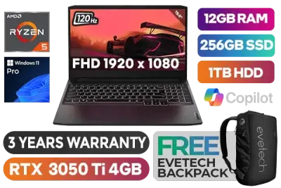 Lenovo IdeaPad Gaming 3 15ACH6 82K200U3SA AMD Ryzen 5 5600H up to 4.20GHz Processor, 16MB Cache, 6x Cores, 12x Threads / 12GB DDR4 RAM / 256GB Ultra-Fast NVMe SSD + 1TB Hard Drive / 15.6" FHD 1920 x 1080 Anti-Glare 120Hz IPS-Level Display / NVIDIA GeForce RTX 3050 Ti 4GB GDDR6 Dedicated Graphics / No DVD Drive Included / <span style="font-size: 20px; color: #00BFFF; font-weight: bold;">Windows 11 Professional (64bit)</span> / HD 720p Webcam With Dual Array Mic / Bluetooth 5.0 / Dual Band WiFi 6 802.11ax Wireless LAN / 2x USB 3.2 Type-A / 1x USB 3.2 Type-C / 1x HDMI 2.0 / Headphone Audio & Microphone Combo Jack / 2x 2W Speaker With Nahimic Audio / White Backlit full-size Keyboard / supports Rapid Charge (1 hour 80%) / FREE Lenovo M100 RGB Gaming Mouse / Lenovo IdeaPad Gaming 3 Ryzen 5 RTX 3050 Ti Gaming Laptop DealLenovo IdeaPad Gaming 3 15ACH6 82K200U3SA AMD Ryzen 5 5600H up to 4.20GHz Processor, 16MB Cache, 6x Cores, 12x Threads / 12GB DDR4 RAM / 256GB Ultra-Fast NVMe SSD + 1TB Hard Drive / 15.6" FHD 1920 x 1080 Anti-Glare 120Hz IPS-Level Display / NVIDIA GeForce RTX 3050 Ti 4GB GDDR6 Dedicated Graphics / No DVD Drive Included / Windows 11 Professional (64bit) / HD 720p Webcam With Dual Array Mic / Bluetooth 5.0 / Dual Band WiFi 6 802.11ax Wireless LAN / 2x USB 3.2 Type-A / 1x USB 3.2 Type-C / 1x HDMI 2.0 / Headphone Audio & Microphone Combo Jack / 2x 2W Speaker With Nahimic Audio / White Backlit full-size Keyboard / supports Rapid Charge (1 hour 80%) / FREE Lenovo M100 RGB Gaming Mouse / Lenovo IdeaPad Gaming 3 Ryzen 5 RTX 3050 Ti Gaming Laptop Deal [82K200U3SA/12GB] / 3 YEARS WARRANTY / [+] GET FREE EVETECH NEO Premium Gaming Backpack+ FREE DELIVERY !