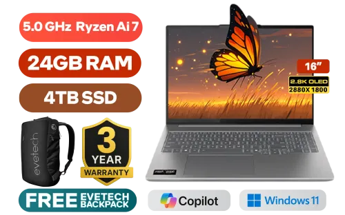 Lenovo Ideapad Pro 5 14IAH10 AMD Ryzen AI 7-350 up to 5.0GHz Processor, 24MB Cache, 8x Cores, 16x Threads / 24GB LPDDR5X RAM / 4TB Ultra-Fast NVMe SSD / 16" 2.8K (2880x1800) OLED Display / Integrated AMD Radeon Graphics / Windows 11 Home (64bit) / RealTek WIFI 7 8922AE Wireless LAN / Bluetooth 5.4 / 1080p FHD IR Camera with Privacy Shutter / 2x USB Type-A / 2x USB-C (DisplayPort™ 2.1 / Power Delivery) / 1 x HDMI / 1x Headphone and Microphone Combo Jack / 1x SD Card Reader / White Backlit Keyboard / 2 Stereo Speakers Optimized with Dolby Atmos Audio / Lenovo Ideapad Pro 5 14IAH10 Ultra 7 Laptop DealLenovo Ideapad Pro 5 14IAH10 AMD Ryzen AI 7-350 up to 5.0GHz Processor, 24MB Cache, 8x Cores, 16x Threads / 24GB LPDDR5X RAM / 4TB Ultra-Fast NVMe SSD / 16" 2.8K (2880x1800) OLED Display / Integrated AMD Radeon Graphics / Windows 11 Home (64bit) / RealTek WIFI 7 8922AE Wireless LAN / Bluetooth 5.4 / 1080p FHD IR Camera with Privacy Shutter / 2x USB Type-A / 2x USB-C (DisplayPort™ 2.1 / Power Delivery) / 1 x HDMI / 1x Headphone and Microphone Combo Jack / 1x SD Card Reader / White Backlit Keyboard / 2 Stereo Speakers Optimized with Dolby Atmos Audio / Lenovo Ideapad Pro 5 14IAH10 Ultra 7 Laptop Deal [83JN003GSA/4TB] / 3 YEARS WARRANTY / [+] GET FREE EVETECH NEO Premium Gaming Backpack+ FREE DELIVERY !