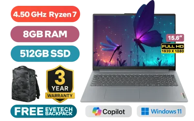 LENOVO IDEAPAD SLIM 3 15ABR8 AMD Ryzen 7 7730U up to 4.50GHz Processor, 20MB Cache, 8x Cores, 16x Threads / 8GB DDR4 RAM / 512GB Ultra-Fast NVME SSD / 15.6" FHD (1920 x 1080) Anti-glare Display / Integrated AMD Radeon Graphics / Windows 11 Home / WiFi 6 Wireless LAN / Bluetooth 5.2 / HD 720p Web Camera With Privacy Shutter / 2x USB 3.2 Gen 1 / 1x USB-C 3.2 Gen 1 / 1x HDMI / 1x Headphone & Microphone Audio Combo Jack / 1x SD Card reader / Non-backlit English Keyboard / Lenovo IdeaPad Slim 3 15ABR8 AMD Ryzen 7 Laptop DealLENOVO IDEAPAD SLIM 3 15ABR8 AMD Ryzen 7 7730U up to 4.50GHz Processor, 20MB Cache, 8x Cores, 16x Threads / 8GB DDR4 RAM / 512GB Ultra-Fast NVME SSD / 15.6" FHD (1920 x 1080) Anti-glare Display / Integrated AMD Radeon Graphics / Windows 11 Home / WiFi 6 Wireless LAN / Bluetooth 5.2 / HD 720p Web Camera With Privacy Shutter / 2x USB 3.2 Gen 1 / 1x USB-C 3.2 Gen 1 / 1x HDMI / 1x Headphone & Microphone Audio Combo Jack / 1x SD Card reader / Non-backlit English Keyboard / Lenovo IdeaPad Slim 3 15ABR8 AMD Ryzen 7 Laptop Deal [82XM00KFSA] / [+] GET FREE EVETECH DASH Premium Gaming Backpack / 3 YEARS WARRANTY + FREE DELIVERY !