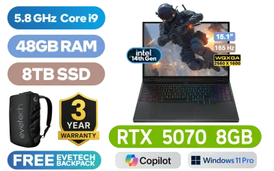 Lenovo Legion 5 15IRX10H 14th Gen Intel® Core™ i9-14900HX up to 5.8GHz Processor, 36MB Cache, 24x Cores, 32x Threads / 48GB DDR5 RAM / 8TB Ultra-Fast NVMe SSD / 15.1" WQXGA (2560x1600) 165Hz, OLED Display / NVIDIA 50 Series GeForce RTX 5070 8GB GDDR7 Dedicated Graphics / <span style="font-size: 20px; color: #00BFFF; font-weight: bold;">Windows 11 Professional (64bit)</span> / Realtek 8922AE WI-FI 7 Wireless LAN / Bluetooth 5.4 / 5.0MP Web Camera with E-shutter / 3 x USB Type-A / 2x USB-C (DisplayPort™) / 1 x HDMI 2.1 / 1x Headphone and Microphone Combo Jack / 1 x RJ45 / RGB Backlit Keyboard / 2x 2W Speaker with HARMAN Audio / Lenovo Legion 5 15IRX10H Intel® Core™ i9 RTX 5070 Gaming Laptop DealLenovo Legion 5 15IRX10H 14th Gen Intel® Core™ i9-14900HX up to 5.8GHz Processor, 36MB Cache, 24x Cores, 32x Threads / 48GB DDR5 RAM / 8TB Ultra-Fast NVMe SSD / 15.1" WQXGA (2560x1600) 165Hz, OLED Display / NVIDIA 50 Series GeForce RTX 5070 8GB GDDR7 Dedicated Graphics / Windows 11 Professional (64bit) / Realtek 8922AE WI-FI 7 Wireless LAN / Bluetooth 5.4 / 5.0MP Web Camera with E-shutter / 3 x USB Type-A / 2x USB-C (DisplayPort™) / 1 x HDMI 2.1 / 1x Headphone and Microphone Combo Jack / 1 x RJ45 / RGB Backlit Keyboard / 2x 2W Speaker with HARMAN Audio / Lenovo Legion 5 15IRX10H Intel® Core™ i9 RTX 5070 Gaming Laptop Deal [83LY002MSA/48GB/8TB] / [+] GET FREE EVETECH NEO Premium Gaming Backpack / 3 YEARS WARRANTY / [+] GET FREE Promate AirClip Wireless Earbuds+ FREE DELIVERY !