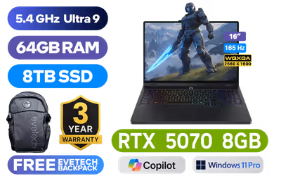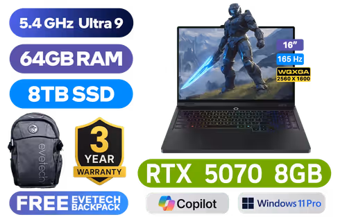 Lenovo Legion Pro 5 16IAX10 Intel® Core™ Ultra 9-275HX up to 5.4GHz Processor, 76MB Cache, 24x Cores, 24x Threads / 64GB DDR5 RAM / 8TB Ultra-Fast NVMe SSD / 16" WQXGA (2560x1600) 165Hz OLED Display / NVIDIA 50 Series GeForce RTX 5070 8GB GDDR7 Dedicated Graphics / <span style="font-size: 20px; color: #00BFFF; font-weight: bold;">Windows 11 Professional </span> / Intel WI-FI 7 Wireless LAN / Bluetooth 5.4 / 5.0MP Web Camera with E-shutter / 3 x USB Type-A / 2x USB-C (Thunderbolt™ 4, DisplayPort™ 2.1) / 1 x HDMI / 1x Headphone and Microphone Audio Combo Jack / 1 x RJ45 / RGB Backlit Keyboard / 2x 2W Stereo Speakers Audio by HARMAN / Lenovo Legion Pro 5 16IAX10 Intel® Core™ Ultra 9 RTX 5070 Gaming Laptop DealLenovo Legion Pro 5 16IAX10 Intel® Core™ Ultra 9-275HX up to 5.4GHz Processor, 76MB Cache, 24x Cores, 24x Threads / 64GB DDR5 RAM / 8TB Ultra-Fast NVMe SSD / 16" WQXGA (2560x1600) 165Hz OLED Display / NVIDIA 50 Series GeForce RTX 5070 8GB GDDR7 Dedicated Graphics / Windows 11 Professional / Intel WI-FI 7 Wireless LAN / Bluetooth 5.4 / 5.0MP Web Camera with E-shutter / 3 x USB Type-A / 2x USB-C (Thunderbolt™ 4, DisplayPort™ 2.1) / 1 x HDMI / 1x Headphone and Microphone Audio Combo Jack / 1 x RJ45 / RGB Backlit Keyboard / 2x 2W Stereo Speakers Audio by HARMAN / Lenovo Legion Pro 5 16IAX10 Intel® Core™ Ultra 9 RTX 5070 Gaming Laptop Deal [83F3006XSA/64GB/8TB] / 3 YEARS WARRANTY / [+] GET FREE EVETECH FLUX Premium Gaming Backpack / [+] Get PRAGMATA with select GeForce RTX 50 Series + FREE DELIVERY !