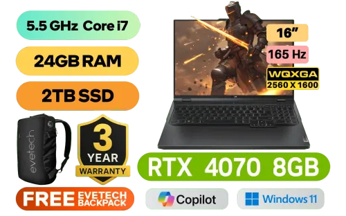 Lenovo Legion Pro 5 16IRX9 14th Gen Intel Core i7-14700HX up to 5.5GHz Processor, 33MB Cache, 20x Cores, 28x Threads / 24GB DDR5 RAM / 2TB Ultra-Fast NVMe SSD / 16" WQXGA (2560x1600) Anti-glare 165Hz IPS-Level Display / NVIDIA 40 Series GeForce RTX 4070 8GB GDDR6 Dedicated Graphics / Windows 11 Home (64bit) / FHD 1080p with Privacy Shutter Camera / Intel Wi-Fi 6E AX211 Wireless LAN / Bluetooth 5.2 / 4 x USB 3.2 Type-A / 2 x USB 3.2 Type-C / 1 x HDMI / 1 x RJ45 / 1 x Headphone Audio & Microphone Combo Jack / 4-Zone RGB Backlit Keyboard / 2x 2W Speaker With Nahimic Audio / FREE Lenovo Legion Mouse Pad / Lenovo Legion Pro 5 16IRX9 Core i7 RTX 4070 Gaming Laptop DealLenovo Legion Pro 5 16IRX9 14th Gen Intel Core i7-14700HX up to 5.5GHz Processor, 33MB Cache, 20x Cores, 28x Threads / 24GB DDR5 RAM / 2TB Ultra-Fast NVMe SSD / 16" WQXGA (2560x1600) Anti-glare 165Hz IPS-Level Display / NVIDIA 40 Series GeForce RTX 4070 8GB GDDR6 Dedicated Graphics / Windows 11 Home (64bit) / FHD 1080p with Privacy Shutter Camera / Intel Wi-Fi 6E AX211 Wireless LAN / Bluetooth 5.2 / 4 x USB 3.2 Type-A / 2 x USB 3.2 Type-C / 1 x HDMI / 1 x RJ45 / 1 x Headphone Audio & Microphone Combo Jack / 4-Zone RGB Backlit Keyboard / 2x 2W Speaker With Nahimic Audio / FREE Lenovo Legion Mouse Pad / Lenovo Legion Pro 5 16IRX9 Core i7 RTX 4070 Gaming Laptop Deal [83DF00CDSA/24GB/2TB] / 3 YEARS WARRANTY / [+] GET FREE EVETECH NEO Premium Gaming Backpack+ FREE DELIVERY !