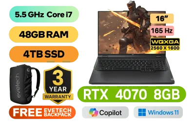 Lenovo Legion Pro 5 16IRX9 14th Gen Intel Core i7-14700HX up to 5.5GHz Processor, 33MB Cache, 20x Cores, 28x Threads / 48GB DDR5 RAM / 4TB Ultra-Fast NVMe SSD / 16" WQXGA (2560x1600) Anti-glare 165Hz IPS-Level Display / NVIDIA 40 Series GeForce RTX 4070 8GB GDDR6 Dedicated Graphics / Windows 11 Home (64bit) / FHD 1080p with Privacy Shutter Camera / Intel Wi-Fi 6E AX211 Wireless LAN / Bluetooth 5.2 / 4 x USB 3.2 Type-A / 2 x USB 3.2 Type-C / 1 x HDMI / 1 x RJ45 / 1 x Headphone Audio & Microphone Combo Jack / 4-Zone RGB Backlit Keyboard / 2x 2W Speaker With Nahimic Audio / FREE Lenovo Legion Mouse Pad / Lenovo Legion Pro 5 16IRX9 Core i7 RTX 4070 Gaming Laptop DealLenovo Legion Pro 5 16IRX9 14th Gen Intel Core i7-14700HX up to 5.5GHz Processor, 33MB Cache, 20x Cores, 28x Threads / 48GB DDR5 RAM / 4TB Ultra-Fast NVMe SSD / 16" WQXGA (2560x1600) Anti-glare 165Hz IPS-Level Display / NVIDIA 40 Series GeForce RTX 4070 8GB GDDR6 Dedicated Graphics / Windows 11 Home (64bit) / FHD 1080p with Privacy Shutter Camera / Intel Wi-Fi 6E AX211 Wireless LAN / Bluetooth 5.2 / 4 x USB 3.2 Type-A / 2 x USB 3.2 Type-C / 1 x HDMI / 1 x RJ45 / 1 x Headphone Audio & Microphone Combo Jack / 4-Zone RGB Backlit Keyboard / 2x 2W Speaker With Nahimic Audio / FREE Lenovo Legion Mouse Pad / Lenovo Legion Pro 5 16IRX9 Core i7 RTX 4070 Gaming Laptop Deal [83DF00CDSA/48GB/4TB] / 3 YEARS WARRANTY / [+] GET FREE EVETECH NEO Premium Gaming Backpack+ FREE DELIVERY !