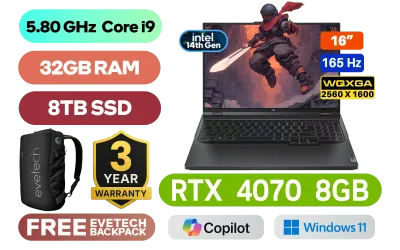 Lenovo Legion Pro 5 16IRX9 14th Gen Intel Core i9-14900HX up to 5.80GHz Processor, 36MB Cache, 24x Cores, 32x Threads / 32GB DDR5 RAM / 8TB Ultra-Fast NVMe SSD / 16" WQXGA (2560x1600) Anti-glare 165Hz IPS-Level Display / NVIDIA 40 Series GeForce RTX 4070 8GB GDDR6 Dedicated Graphics / Windows 11 Home (64bit) / 1080P With Privacy Shutter With Dual Array Microphone / Intel Wi-Fi 6E Wireless LAN / Bluetooth 5.2 / 4 x USB 3.2 Type-A / 2 x USB 3.2 Type-C / 1 x HDMI / 1 x RJ45 / 1 x Headphone Audio & Microphone Combo Jack / RGB Backlit Keyboard / 2x 2W Speaker With Nahimic Audio / FREE Lenovo Legion Gaming Speed Mouse Pad / Lenovo Legion Pro 5 16IRX9 Core i9 RTX 4070 Gaming Laptop DealLenovo Legion Pro 5 16IRX9 14th Gen Intel Core i9-14900HX up to 5.80GHz Processor, 36MB Cache, 24x Cores, 32x Threads / 32GB DDR5 RAM / 8TB Ultra-Fast NVMe SSD / 16" WQXGA (2560x1600) Anti-glare 165Hz IPS-Level Display / NVIDIA 40 Series GeForce RTX 4070 8GB GDDR6 Dedicated Graphics / Windows 11 Home (64bit) / 1080P With Privacy Shutter With Dual Array Microphone / Intel Wi-Fi 6E Wireless LAN / Bluetooth 5.2 / 4 x USB 3.2 Type-A / 2 x USB 3.2 Type-C / 1 x HDMI / 1 x RJ45 / 1 x Headphone Audio & Microphone Combo Jack / RGB Backlit Keyboard / 2x 2W Speaker With Nahimic Audio / FREE Lenovo Legion Gaming Speed Mouse Pad / Lenovo Legion Pro 5 16IRX9 Core i9 RTX 4070 Gaming Laptop Deal [83DF00CESA/32GB/8TB] / [+] GET FREE Promate Lush-Pro TWS Wireless Earphones / [+] GET FREE EVETECH NEO Premium Gaming Backpack / 3 YEARS WARRANTY + FREE DELIVERY !