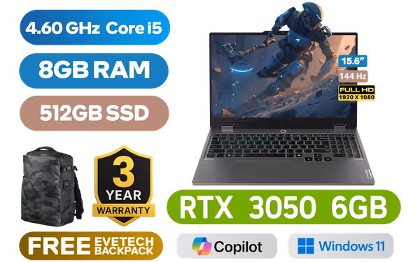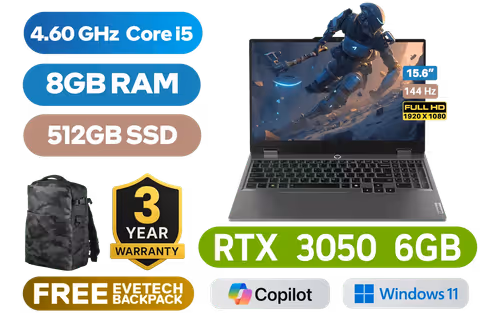 Lenovo LOQ 15IAX9 12th Gen Intel Core i5-12600HX up to 4.60GHz Processor, 18MB Cache,12x Cores, 16x Threads / 8GB DDR5 RAM / 512GB Ultra-Fast NVMe SSD / 15.6" FHD (1920 x 1080) 144Hz IPS-Level Display / NVIDIA GeForce RTX 3050 6GB GDDR6 Dedicated Graphics / Windows 11 Home (64bit) / Realtek WI-FI 6 8852BE Wireless LAN / Bluetooth 5.2 / 720p HD Camera with E-shutter / 3 x USB Type-A / 1 x USB Type-C (Power Delivery 140W / DisplayPort™ 1.4) / 1 x HDMI / 1x Headphone and Microphone Combo Jack / 1 x RJ-45 / White Backlit Keyboard / 2x Stereo Speakers optimized with Nahimic Audio / Free Lenovo LOQ M100 RGB Gaming Mouse / Lenovo LOQ 15IAX9 Core i5 RTX 3050 Gaming Laptop DealLenovo LOQ 15IAX9 12th Gen Intel Core i5-12600HX up to 4.60GHz Processor, 18MB Cache,12x Cores, 16x Threads / 8GB DDR5 RAM / 512GB Ultra-Fast NVMe SSD / 15.6" FHD (1920 x 1080) 144Hz IPS-Level Display / NVIDIA GeForce RTX 3050 6GB GDDR6 Dedicated Graphics / Windows 11 Home (64bit) / Realtek WI-FI 6 8852BE Wireless LAN / Bluetooth 5.2 / 720p HD Camera with E-shutter / 3 x USB Type-A / 1 x USB Type-C (Power Delivery 140W / DisplayPort™ 1.4) / 1 x HDMI / 1x Headphone and Microphone Combo Jack / 1 x RJ-45 / White Backlit Keyboard / 2x Stereo Speakers optimized with Nahimic Audio / Free Lenovo LOQ M100 RGB Gaming Mouse / Lenovo LOQ 15IAX9 Core i5 RTX 3050 Gaming Laptop Deal [83GS00UPSA] / 3 YEARS WARRANTY / [+] GET FREE EVETECH DASH Premium Gaming Backpack+ FREE DELIVERY !