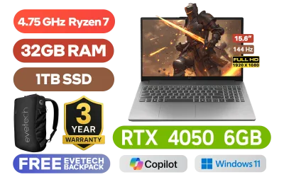 Lenovo LOQ 15ARP10E AMD Ryzen 7 7735HS up to 4.75GHz Processor, 20MB Cache, 8x Cores, 16x Threads / 32GB DDR5 RAM / 1TB Ultra-Fast NVMe SSD / 15.6" FHD (1920x1080) 144Hz IPS-Level Display / NVIDIA GeForce RTX 4050 6GB GDDR6 Dedicated Graphics / Windows 11 Home (64bit) / MediaTek WI-FI 6 MT7920 Wireless LAN / Bluetooth 5.2 / 720p HD Camera With E-Shutter / 1x Headphone and Microphone combo jack / 2x USB Type-A / 1x USB Type-C (Supports Power Delivery 3.0) / 1 x HDMI / / 1x RJ45 / 1x SD Card Reader / White Backlit Keyboard / 2 Stereo Speakers with Nahimic Audio / Lenovo LOQ 15ARP10E Ryzen 7 RTX 4050 Gaming Laptop DealLenovo LOQ 15ARP10E AMD Ryzen 7 7735HS up to 4.75GHz Processor, 20MB Cache, 8x Cores, 16x Threads / 32GB DDR5 RAM / 1TB Ultra-Fast NVMe SSD / 15.6" FHD (1920x1080) 144Hz IPS-Level Display / NVIDIA GeForce RTX 4050 6GB GDDR6 Dedicated Graphics / Windows 11 Home (64bit) / MediaTek WI-FI 6 MT7920 Wireless LAN / Bluetooth 5.2 / 720p HD Camera With E-Shutter / 1x Headphone and Microphone combo jack / 2x USB Type-A / 1x USB Type-C (Supports Power Delivery 3.0) / 1 x HDMI / / 1x RJ45 / 1x SD Card Reader / White Backlit Keyboard / 2 Stereo Speakers with Nahimic Audio / Lenovo LOQ 15ARP10E Ryzen 7 RTX 4050 Gaming Laptop Deal [83S0001PSA/32GB] / 3 YEARS WARRANTY / [+] GET FREE EVETECH NEO Premium Gaming Backpack+ FREE DELIVERY !