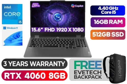 Lenovo LOQ 15IAX9 12th Gen Intel Core i5-12450HX up to 4.40GHz Processor, 20MB Cache, 8x Cores, 12x Threads / 16GB DDR5 RAM / 512GB Ultra-Fast NVMe SSD / 15.6" FHD 1920x1080 Anti-glare 144Hz IPS-Level Display / NVIDIA GeForce RTX 4060 8GB GDDR6 Dedicated Graphics / Windows 11 Home (64bit) / HD 720p with E-shutter / Intel WI-FI 6 Dual Wireless LAN / Bluetooth 5.2 / 3 x USB Type-A / 1 x USB Type-C (Power Delivery 140W & DisplayPort™ 1.4) / 1 x HDMI 2.1 / 1 x Headphone Audio & Microphone Combo Jack / 1 x RJ-45 / White Backlit Keyboard / 2x 2W Speaker With Nahimic Audio / Free Lenovo LOQ M100 RGB Gaming Mouse / Lenovo LOQ 15IAX9 Core i5 RTX 4060 Gaming Laptop DealLenovo LOQ 15IAX9 12th Gen Intel Core i5-12450HX up to 4.40GHz Processor, 20MB Cache, 8x Cores, 12x Threads / 16GB DDR5 RAM / 512GB Ultra-Fast NVMe SSD / 15.6" FHD 1920x1080 Anti-glare 144Hz IPS-Level Display / NVIDIA GeForce RTX 4060 8GB GDDR6 Dedicated Graphics / Windows 11 Home (64bit) / HD 720p with E-shutter / Intel WI-FI 6 Dual Wireless LAN / Bluetooth 5.2 / 3 x USB Type-A / 1 x USB Type-C (Power Delivery 140W & DisplayPort™ 1.4) / 1 x HDMI 2.1 / 1 x Headphone Audio & Microphone Combo Jack / 1 x RJ-45 / White Backlit Keyboard / 2x 2W Speaker With Nahimic Audio / Free Lenovo LOQ M100 RGB Gaming Mouse / Lenovo LOQ 15IAX9 Core i5 RTX 4060 Gaming Laptop Deal [83GS00A4SA/16GB] / 3 YEARS WARRANTY / [+] GET FREE EVETECH NEO Premium Gaming Backpack+ FREE DELIVERY !
