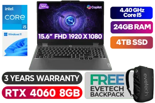 Lenovo LOQ 15IAX9 12th Gen Intel Core i5-12450HX up to 4.40GHz Processor, 20MB Cache, 8x Cores, 12x Threads / 24GB DDR5 RAM / 4TB Ultra-Fast NVMe SSD / 15.6" FHD 1920x1080 Anti-glare 144Hz IPS-Level Display / NVIDIA GeForce RTX 4060 8GB GDDR6 Dedicated Graphics / Windows 11 Home (64bit) / HD 720p with E-shutter / Intel WI-FI 6 Dual Wireless LAN / Bluetooth 5.2 / 3 x USB Type-A / 1 x USB Type-C (Power Delivery 140W & DisplayPort™ 1.4) / 1 x HDMI 2.1 / 1 x Headphone Audio & Microphone Combo Jack / 1 x RJ-45 / White Backlit Keyboard / 2x 2W Speaker With Nahimic Audio / Free Lenovo LOQ M100 RGB Gaming Mouse / Lenovo LOQ 15IAX9 Core i5 RTX 4060 Gaming Laptop DealLenovo LOQ 15IAX9 12th Gen Intel Core i5-12450HX up to 4.40GHz Processor, 20MB Cache, 8x Cores, 12x Threads / 24GB DDR5 RAM / 4TB Ultra-Fast NVMe SSD / 15.6" FHD 1920x1080 Anti-glare 144Hz IPS-Level Display / NVIDIA GeForce RTX 4060 8GB GDDR6 Dedicated Graphics / Windows 11 Home (64bit) / HD 720p with E-shutter / Intel WI-FI 6 Dual Wireless LAN / Bluetooth 5.2 / 3 x USB Type-A / 1 x USB Type-C (Power Delivery 140W & DisplayPort™ 1.4) / 1 x HDMI 2.1 / 1 x Headphone Audio & Microphone Combo Jack / 1 x RJ-45 / White Backlit Keyboard / 2x 2W Speaker With Nahimic Audio / Free Lenovo LOQ M100 RGB Gaming Mouse / Lenovo LOQ 15IAX9 Core i5 RTX 4060 Gaming Laptop Deal [83GS00A4SA/24GB/4TB] / 3 YEARS WARRANTY / [+] GET FREE EVETECH NEO Premium Gaming Backpack+ FREE DELIVERY !
