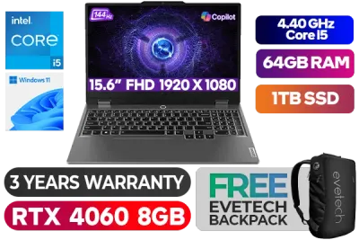 Lenovo LOQ 15IAX9 12th Gen Intel Core i5-12450HX up to 4.40GHz Processor, 20MB Cache, 8x Cores, 12x Threads / 64GB DDR5 RAM / 1TB Ultra-Fast NVMe SSD / 15.6" FHD 1920x1080 Anti-glare 144Hz IPS-Level Display / NVIDIA GeForce RTX 4060 8GB GDDR6 Dedicated Graphics / Windows 11 Home (64bit) / HD 720p with E-shutter / Intel WI-FI 6 Dual Wireless LAN / Bluetooth 5.2 / 3 x USB Type-A / 1 x USB Type-C (Power Delivery 140W & DisplayPort™ 1.4) / 1 x HDMI 2.1 / 1 x Headphone Audio & Microphone Combo Jack / 1 x RJ-45 / White Backlit Keyboard / 2x 2W Speaker With Nahimic Audio / Free Lenovo LOQ M100 RGB Gaming Mouse / Lenovo LOQ 15IAX9 Core i5 RTX 4060 Gaming Laptop DealLenovo LOQ 15IAX9 12th Gen Intel Core i5-12450HX up to 4.40GHz Processor, 20MB Cache, 8x Cores, 12x Threads / 64GB DDR5 RAM / 1TB Ultra-Fast NVMe SSD / 15.6" FHD 1920x1080 Anti-glare 144Hz IPS-Level Display / NVIDIA GeForce RTX 4060 8GB GDDR6 Dedicated Graphics / Windows 11 Home (64bit) / HD 720p with E-shutter / Intel WI-FI 6 Dual Wireless LAN / Bluetooth 5.2 / 3 x USB Type-A / 1 x USB Type-C (Power Delivery 140W & DisplayPort™ 1.4) / 1 x HDMI 2.1 / 1 x Headphone Audio & Microphone Combo Jack / 1 x RJ-45 / White Backlit Keyboard / 2x 2W Speaker With Nahimic Audio / Free Lenovo LOQ M100 RGB Gaming Mouse / Lenovo LOQ 15IAX9 Core i5 RTX 4060 Gaming Laptop Deal [83GS00A4SA/64GB/1TB] / 3 YEARS WARRANTY / [+] GET FREE EVETECH NEO Premium Gaming Backpack+ FREE DELIVERY !