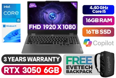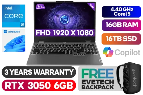 Lenovo LOQ 15IAX9 12th Gen Intel Core i5-12450HX up to 4.40GHz Processor, 12MB Cache, 8x Cores, 12x Threads / 16GB DDR5 RAM / 16TB Ultra-Fast NVMe SSD / 15.6" FHD 1920x1080 Anti-glare 144Hz IPS-Level Display / NVIDIA GeForce RTX 3050 6GB GDDR6 Dedicated Graphics / Windows 11 Home (64bit) / HD 720p with E-shutter / Realtek WI-FI 6 Dual Wireless LAN / Bluetooth 5.2 / 3 x USB Type-A / 1 x USB Type-C (Power Delivery 140W & DisplayPort™ 1.4) / 1 x HDMI 2.1 / 1x Headphone Audio & Microphone Combo Jack / 1 x RJ-45 Ethernet Port / White Backlit Keyboard / 2x 2W Speaker With Nahimic Audio /+ Free Lenovo LOQ M100 RGB Gaming Mouse / Lenovo LOQ 15IAX9 Core i5 RTX 3050 Gaming Laptop DealLenovo LOQ 15IAX9 12th Gen Intel Core i5-12450HX up to 4.40GHz Processor, 12MB Cache, 8x Cores, 12x Threads / 16GB DDR5 RAM / 16TB Ultra-Fast NVMe SSD / 15.6" FHD 1920x1080 Anti-glare 144Hz IPS-Level Display / NVIDIA GeForce RTX 3050 6GB GDDR6 Dedicated Graphics / Windows 11 Home (64bit) / HD 720p with E-shutter / Realtek WI-FI 6 Dual Wireless LAN / Bluetooth 5.2 / 3 x USB Type-A / 1 x USB Type-C (Power Delivery 140W & DisplayPort™ 1.4) / 1 x HDMI 2.1 / 1x Headphone Audio & Microphone Combo Jack / 1 x RJ-45 Ethernet Port / White Backlit Keyboard / 2x 2W Speaker With Nahimic Audio /+ Free Lenovo LOQ M100 RGB Gaming Mouse / Lenovo LOQ 15IAX9 Core i5 RTX 3050 Gaming Laptop Deal [83GS00A3SA/16GB/16TB] / 3 YEARS WARRANTY / [+] GET FREE EVETECH NEO Premium Gaming Backpack+ FREE DELIVERY !