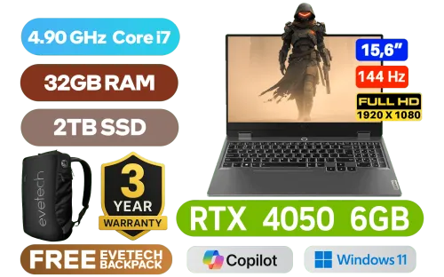 Lenovo LOQ 15IRX9 13th Gen Intel Core i7-13650HX up to 4.90GHz Processor, 24MB Cache, 14x Cores, 20x Threads / 32GB DDR5 RAM / 2TB Ultra-Fast NVMe SSD / 15.6" FHD 1920x1080 Anti-glare 144Hz IPS-Level Display / NVIDIA GeForce RTX 4050 6GB GDDR6 Dedicated Graphics / Windows 11 Home (64bit) / FHD 1080p with E-shutter / Realtek WI-FI 6 802.11ax Wireless LAN / Bluetooth 5.2 / 3 x USB Type-A / 1 x USB Type-C (Power Delivery 140W & DisplayPort™ 1.4) / 1 x HDMI 2.1 / 1x Headphone Audio & Microphone Combo Jack / 1 x RJ-45 Ethernet Port / 4-Zone RGB Backlit Keyboard / 2x 2W Speaker With Nahimic Audio / Lenovo LOQ Core i7 RTX 4050 Gaming Laptop DealLenovo LOQ 15IRX9 13th Gen Intel Core i7-13650HX up to 4.90GHz Processor, 24MB Cache, 14x Cores, 20x Threads / 32GB DDR5 RAM / 2TB Ultra-Fast NVMe SSD / 15.6" FHD 1920x1080 Anti-glare 144Hz IPS-Level Display / NVIDIA GeForce RTX 4050 6GB GDDR6 Dedicated Graphics / Windows 11 Home (64bit) / FHD 1080p with E-shutter / Realtek WI-FI 6 802.11ax Wireless LAN / Bluetooth 5.2 / 3 x USB Type-A / 1 x USB Type-C (Power Delivery 140W & DisplayPort™ 1.4) / 1 x HDMI 2.1 / 1x Headphone Audio & Microphone Combo Jack / 1 x RJ-45 Ethernet Port / 4-Zone RGB Backlit Keyboard / 2x 2W Speaker With Nahimic Audio / Lenovo LOQ Core i7 RTX 4050 Gaming Laptop Deal [83DV00JAFU/32GB/2TB] / 3 YEARS WARRANTY / [+] GET FREE EVETECH NEO Premium Gaming Backpack+ FREE DELIVERY !