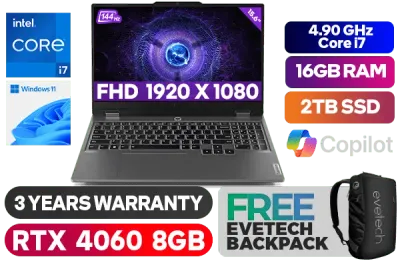 Lenovo LOQ 15IRX9 83DV00J9SA 13th Gen Intel Core i7-13650HX up to 4.90GHz Processor, 24MB Cache, 14x Cores, 20x Threads / 16GB DDR5 RAM / 2TB Ultra-Fast NVMe SSD / 15.6" FHD 1920x1080 Anti-glare 144Hz IPS-Level Display / NVIDIA GeForce RTX 4060 8GB GDDR6 Dedicated Graphics / Windows 11 Home (64bit) / FHD 1080p with E-shutter / Intel WI-FI 6 Dual Wireless LAN / Bluetooth 5.2 / 3 x USB Type-A / 1 x USB Type-C (Power Delivery 140W & DisplayPort™ 1.4) / 1 x HDMI 2.1 / Headphone Audio & Microphone Combo Jack / 1 x RJ-45 Ethernet Port / 4-Zone RGB Backlit Keyboard / 2x 2W Speaker With Nahimic Audio / Lenovo LOQ Core i7 RTX 4060 Gaming Laptop DealLenovo LOQ 15IRX9 83DV00J9SA 13th Gen Intel Core i7-13650HX up to 4.90GHz Processor, 24MB Cache, 14x Cores, 20x Threads / 16GB DDR5 RAM / 2TB Ultra-Fast NVMe SSD / 15.6" FHD 1920x1080 Anti-glare 144Hz IPS-Level Display / NVIDIA GeForce RTX 4060 8GB GDDR6 Dedicated Graphics / Windows 11 Home (64bit) / FHD 1080p with E-shutter / Intel WI-FI 6 Dual Wireless LAN / Bluetooth 5.2 / 3 x USB Type-A / 1 x USB Type-C (Power Delivery 140W & DisplayPort™ 1.4) / 1 x HDMI 2.1 / Headphone Audio & Microphone Combo Jack / 1 x RJ-45 Ethernet Port / 4-Zone RGB Backlit Keyboard / 2x 2W Speaker With Nahimic Audio / Lenovo LOQ Core i7 RTX 4060 Gaming Laptop Deal [83DV00J9SA/2TB] / 3 YEARS WARRANTY / [+] GET FREE EVETECH NEO Premium Gaming Backpack+ FREE DELIVERY !
