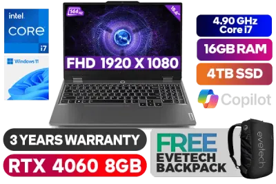 Lenovo LOQ 15IRX9 83DV00J9SA 13th Gen Intel Core i7-13650HX up to 4.90GHz Processor, 24MB Cache, 14x Cores, 20x Threads / 16GB DDR5 RAM / 4TB Ultra-Fast NVMe SSD / 15.6" FHD 1920x1080 Anti-glare 144Hz IPS-Level Display / NVIDIA GeForce RTX 4060 8GB GDDR6 Dedicated Graphics / Windows 11 Home (64bit) / FHD 1080p with E-shutter / Intel WI-FI 6 Dual Wireless LAN / Bluetooth 5.2 / 3 x USB Type-A / 1 x USB Type-C (Power Delivery 140W & DisplayPort™ 1.4) / 1 x HDMI 2.1 / Headphone Audio & Microphone Combo Jack / 1 x RJ-45 Ethernet Port / 4-Zone RGB Backlit Keyboard / 2x 2W Speaker With Nahimic Audio / Lenovo LOQ Core i7 RTX 4060 Gaming Laptop DealLenovo LOQ 15IRX9 83DV00J9SA 13th Gen Intel Core i7-13650HX up to 4.90GHz Processor, 24MB Cache, 14x Cores, 20x Threads / 16GB DDR5 RAM / 4TB Ultra-Fast NVMe SSD / 15.6" FHD 1920x1080 Anti-glare 144Hz IPS-Level Display / NVIDIA GeForce RTX 4060 8GB GDDR6 Dedicated Graphics / Windows 11 Home (64bit) / FHD 1080p with E-shutter / Intel WI-FI 6 Dual Wireless LAN / Bluetooth 5.2 / 3 x USB Type-A / 1 x USB Type-C (Power Delivery 140W & DisplayPort™ 1.4) / 1 x HDMI 2.1 / Headphone Audio & Microphone Combo Jack / 1 x RJ-45 Ethernet Port / 4-Zone RGB Backlit Keyboard / 2x 2W Speaker With Nahimic Audio / Lenovo LOQ Core i7 RTX 4060 Gaming Laptop Deal [83DV00J9SA/4TB] / 3 YEARS WARRANTY / [+] GET FREE EVETECH NEO Premium Gaming Backpack+ FREE DELIVERY !