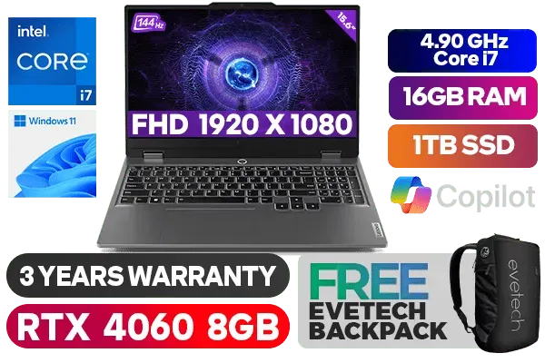Lenovo LOQ 15IRX9 83DV00J9SA 13th Gen Intel Core i7-13650HX up to 4.90GHz Processor, 24MB Cache, 14x Cores, 20x Threads / 16GB DDR5 RAM / 1TB Ultra-Fast NVMe SSD / 15.6" FHD 1920x1080 Anti-glare 144Hz IPS-Level Display / NVIDIA GeForce RTX 4060 8GB GDDR6 Dedicated Graphics / Windows 11 Home (64bit) / FHD 1080p with E-shutter / Intel WI-FI 6 Dual Wireless LAN / Bluetooth 5.2 / 3 x USB Type-A / 1 x USB Type-C (Power Delivery 140W & DisplayPort™ 1.4) / 1 x HDMI 2.1 / Headphone Audio & Microphone Combo Jack / 1 x RJ-45 Ethernet Port / 4-Zone RGB Backlit Keyboard / 2x 2W Speaker With Nahimic Audio / Lenovo LOQ Core i7 RTX 4060 Gaming Laptop DealLenovo LOQ 15IRX9 83DV00J9SA 13th Gen Intel Core i7-13650HX up to 4.90GHz Processor, 24MB Cache, 14x Cores, 20x Threads / 16GB DDR5 RAM / 1TB Ultra-Fast NVMe SSD / 15.6" FHD 1920x1080 Anti-glare 144Hz IPS-Level Display / NVIDIA GeForce RTX 4060 8GB GDDR6 Dedicated Graphics / Windows 11 Home (64bit) / FHD 1080p with E-shutter / Intel WI-FI 6 Dual Wireless LAN / Bluetooth 5.2 / 3 x USB Type-A / 1 x USB Type-C (Power Delivery 140W & DisplayPort™ 1.4) / 1 x HDMI 2.1 / Headphone Audio & Microphone Combo Jack / 1 x RJ-45 Ethernet Port / 4-Zone RGB Backlit Keyboard / 2x 2W Speaker With Nahimic Audio / Lenovo LOQ Core i7 RTX 4060 Gaming Laptop Deal [83DV00J9SA] / 3 YEARS WARRANTY / [+] GET FREE EVETECH NEO Premium Gaming Backpack+ FREE DELIVERY !