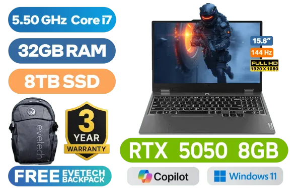 Lenovo LOQ 15IRX10 14th Gen Intel Core Intel i7-14700HX up to 5.50GHz Processor, 33MB Cache, 20x Cores, 28x Threads / 32GB DDR5 RAM / 8TB Ultra-Fast NVMe SSD / 15.6" FHD (1920x1080) Anti-glare 144Hz IPS-Level Display / NVIDIA GeForce RTX 5050 8GB GDDR7 Dedicated Graphics / Windows 11 Home (64bit) / RealTek RTL8852BE Wi-Fi 6 Wireless LAN / Bluetooth 5.2 / 5.0MP Web Camera with E-Shutter / 3 x USB Type-A / 1 x USB Type-C with DisplayPort™ 1.4 / 1 x HDMI 2.1 / 1x RJ45 / 1 x Headphone and Microphone Combo Jack / White Backlit Keyboard / 2x 2W Speaker with Realtek® ALC3287 codec / Lenovo LOQ Core i7 RTX 5050 Gaming Laptop DealLenovo LOQ 15IRX10 14th Gen Intel Core Intel i7-14700HX up to 5.50GHz Processor, 33MB Cache, 20x Cores, 28x Threads / 32GB DDR5 RAM / 8TB Ultra-Fast NVMe SSD / 15.6" FHD (1920x1080) Anti-glare 144Hz IPS-Level Display / NVIDIA GeForce RTX 5050 8GB GDDR7 Dedicated Graphics / Windows 11 Home (64bit) / RealTek RTL8852BE Wi-Fi 6 Wireless LAN / Bluetooth 5.2 / 5.0MP Web Camera with E-Shutter / 3 x USB Type-A / 1 x USB Type-C with DisplayPort™ 1.4 / 1 x HDMI 2.1 / 1x RJ45 / 1 x Headphone and Microphone Combo Jack / White Backlit Keyboard / 2x 2W Speaker with Realtek® ALC3287 codec / Lenovo LOQ Core i7 RTX 5050 Gaming Laptop Deal [83JE002USA/32GB/8TB] / 3 YEARS WARRANTY / [+] GET FREE EVETECH FLUX Premium Gaming Backpack+ FREE DELIVERY !