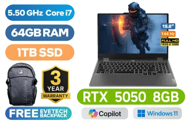 Lenovo LOQ 15IRX10 14th Gen Intel Core Intel i7-14700HX up to 5.50GHz Processor, 33MB Cache, 20x Cores, 28x Threads / 64GB DDR5 RAM / 1TB Ultra-Fast NVMe SSD / 15.6" FHD (1920x1080) Anti-glare 144Hz IPS-Level Display / NVIDIA GeForce RTX 5050 8GB GDDR7 Dedicated Graphics / Windows 11 Home (64bit) / RealTek RTL8852BE Wi-Fi 6 Wireless LAN / Bluetooth 5.2 / 5.0MP Web Camera with E-Shutter / 3 x USB Type-A / 1 x USB Type-C with DisplayPort™ 1.4 / 1 x HDMI 2.1 / 1x RJ45 / 1 x Headphone and Microphone Combo Jack / White Backlit Keyboard / 2x 2W Speaker with Realtek® ALC3287 codec / Lenovo LOQ Core i7 RTX 5050 Gaming Laptop DealLenovo LOQ 15IRX10 14th Gen Intel Core Intel i7-14700HX up to 5.50GHz Processor, 33MB Cache, 20x Cores, 28x Threads / 64GB DDR5 RAM / 1TB Ultra-Fast NVMe SSD / 15.6" FHD (1920x1080) Anti-glare 144Hz IPS-Level Display / NVIDIA GeForce RTX 5050 8GB GDDR7 Dedicated Graphics / Windows 11 Home (64bit) / RealTek RTL8852BE Wi-Fi 6 Wireless LAN / Bluetooth 5.2 / 5.0MP Web Camera with E-Shutter / 3 x USB Type-A / 1 x USB Type-C with DisplayPort™ 1.4 / 1 x HDMI 2.1 / 1x RJ45 / 1 x Headphone and Microphone Combo Jack / White Backlit Keyboard / 2x 2W Speaker with Realtek® ALC3287 codec / Lenovo LOQ Core i7 RTX 5050 Gaming Laptop Deal [83JE002USA/64GB] / 3 YEARS WARRANTY / [+] GET FREE EVETECH FLUX Premium Gaming Backpack+ FREE DELIVERY !