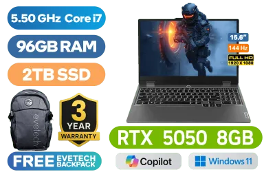 Lenovo LOQ 15IRX10 14th Gen Intel Core Intel i7-14700HX up to 5.50GHz Processor, 33MB Cache, 20x Cores, 28x Threads / 96GB DDR5 RAM / 2TB Ultra-Fast NVMe SSD / 15.6" FHD (1920x1080) Anti-glare 144Hz IPS-Level Display / NVIDIA GeForce RTX 5050 8GB GDDR7 Dedicated Graphics / Windows 11 Home (64bit) / RealTek RTL8852BE Wi-Fi 6 Wireless LAN / Bluetooth 5.2 / 5.0MP Web Camera with E-Shutter / 3 x USB Type-A / 1 x USB Type-C with DisplayPort™ 1.4 / 1 x HDMI 2.1 / 1x RJ45 / 1 x Headphone and Microphone Combo Jack / White Backlit Keyboard / 2x 2W Speaker with Realtek® ALC3287 codec / Lenovo LOQ Core i7 RTX 5050 Gaming Laptop DealLenovo LOQ 15IRX10 14th Gen Intel Core Intel i7-14700HX up to 5.50GHz Processor, 33MB Cache, 20x Cores, 28x Threads / 96GB DDR5 RAM / 2TB Ultra-Fast NVMe SSD / 15.6" FHD (1920x1080) Anti-glare 144Hz IPS-Level Display / NVIDIA GeForce RTX 5050 8GB GDDR7 Dedicated Graphics / Windows 11 Home (64bit) / RealTek RTL8852BE Wi-Fi 6 Wireless LAN / Bluetooth 5.2 / 5.0MP Web Camera with E-Shutter / 3 x USB Type-A / 1 x USB Type-C with DisplayPort™ 1.4 / 1 x HDMI 2.1 / 1x RJ45 / 1 x Headphone and Microphone Combo Jack / White Backlit Keyboard / 2x 2W Speaker with Realtek® ALC3287 codec / Lenovo LOQ Core i7 RTX 5050 Gaming Laptop Deal [83JE002USA/96GB/2TB] / 3 YEARS WARRANTY / [+] GET FREE EVETECH FLUX Premium Gaming Backpack+ FREE DELIVERY !