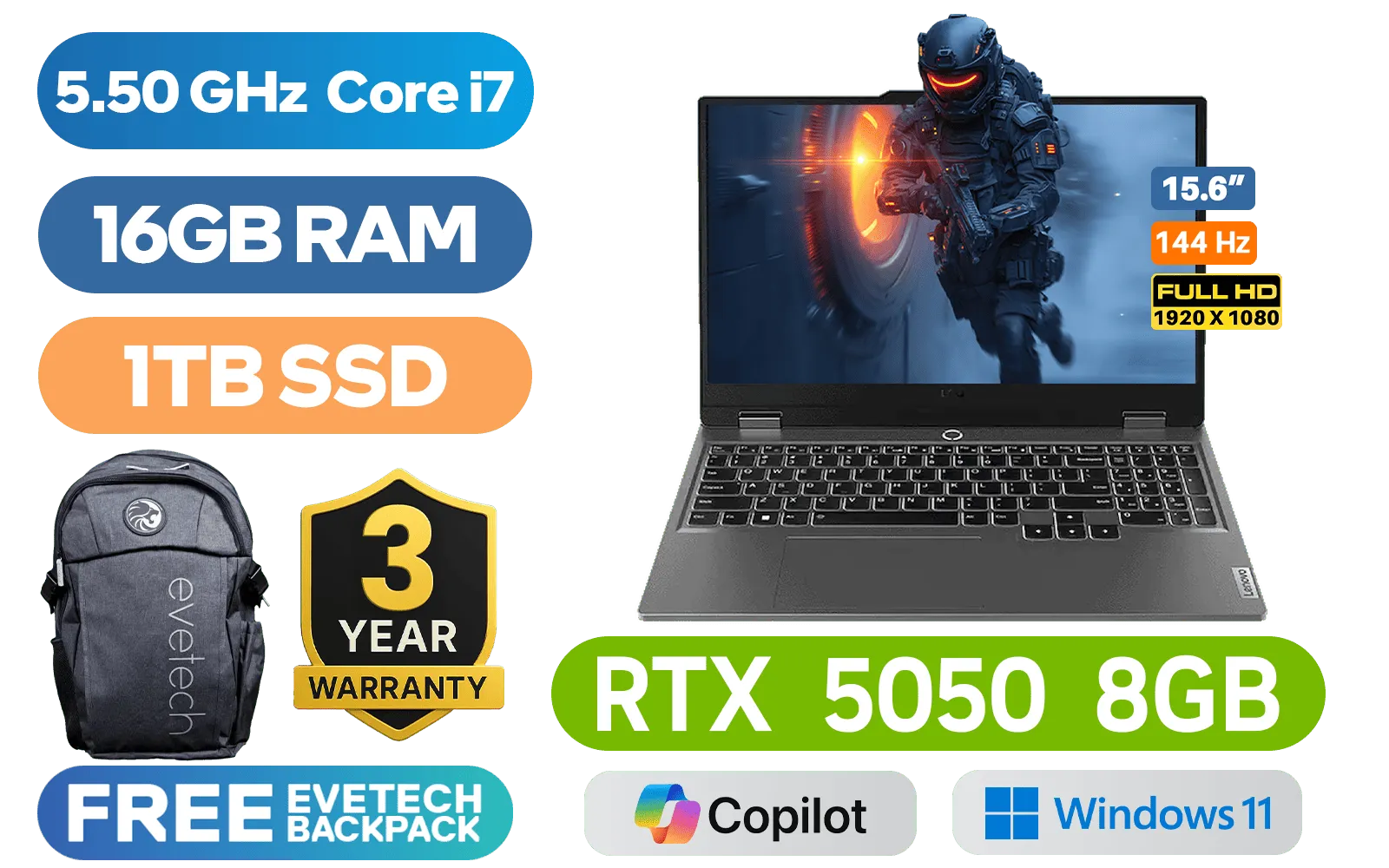 Lenovo LOQ 15IRX10 14th Gen Intel Core Intel i7-14700HX up to 5.50GHz Processor, 33MB Cache, 20x Cores, 28x Threads / 16GB DDR5 RAM / 1TB Ultra-Fast NVMe SSD / 15.6" FHD (1920x1080) Anti-glare 144Hz IPS-Level Display / NVIDIA GeForce RTX 5050 8GB GDDR7 Dedicated Graphics / Windows 11 Home (64bit) / RealTek RTL8852BE Wi-Fi 6 Wireless LAN / Bluetooth 5.2 / 5.0MP Web Camera with E-Shutter / 3 x USB Type-A / 1 x USB Type-C with DisplayPortâĸ 1.4 / 1 x HDMI 2.1 / 1x RJ45 / 1 x Headphone and Microphone Combo Jack / White Backlit Keyboard / 2x 2W Speaker with RealtekÂŽ ALC3287 codec / Lenovo LOQ Core i7 RTX 5050 Gaming Laptop DealLenovo LOQ 15IRX10 14th Gen Intel Core Intel i7-14700HX up to 5.50GHz Processor, 33MB Cache, 20x Cores, 28x Threads / 16GB DDR5 RAM / 1TB Ultra-Fast NVMe SSD / 15.6" FHD (1920x1080) Anti-glare 144Hz IPS-Level Display / NVIDIA GeForce RTX 5050 8GB GDDR7 Dedicated Graphics / Windows 11 Home (64bit) / RealTek RTL8852BE Wi-Fi 6 Wireless LAN / Bluetooth 5.2 / 5.0MP Web Camera with E-Shutter / 3 x USB Type-A / 1 x USB Type-C with DisplayPortâĸ 1.4 / 1 x HDMI 2.1 / 1x RJ45 / 1 x Headphone and Microphone Combo Jack / White Backlit Keyboard / 2x 2W Speaker with RealtekÂŽ ALC3287 codec / Lenovo LOQ Core i7 RTX 5050 Gaming Laptop Deal [83JE002USA] / 3 YEARS WARRANTY / [+] GET FREE EVETECH FLUX Premium Gaming Backpack+ FREE DELIVERY !