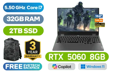 Lenovo LOQ 15IRX10 14th Gen Intel Core Intel i7-14700HX up to 5.50GHz Processor, 33MB Cache, 20x Cores, 28x Threads / 32GB DDR5 RAM / 2TB Ultra-Fast NVMe SSD / 15.6" FHD (1920x1080) Anti-glare 144Hz IPS-Level Display / NVIDIA GeForce RTX 5060 8GB GDDR7 Dedicated Graphics / Windows 11 Home (64bit) / RealTek RTL8852BE Wi-Fi 6 Wireless LAN / Bluetooth 5.2 / 5.0MP Web Camera with E-Shutter / 3 x USB Type-A / 1 x USB Type-C DisplayPort™ 1.4 / 1 x HDMI 2.1 / 1x RJ45 / 1 x Headphone and Microphone Combo Jack / White Backlit Keyboard / 2x 2W Speaker with Realtek® ALC3287 codec / Lenovo LOQ Core i7 RTX 5060 Gaming Laptop DealLenovo LOQ 15IRX10 14th Gen Intel Core Intel i7-14700HX up to 5.50GHz Processor, 33MB Cache, 20x Cores, 28x Threads / 32GB DDR5 RAM / 2TB Ultra-Fast NVMe SSD / 15.6" FHD (1920x1080) Anti-glare 144Hz IPS-Level Display / NVIDIA GeForce RTX 5060 8GB GDDR7 Dedicated Graphics / Windows 11 Home (64bit) / RealTek RTL8852BE Wi-Fi 6 Wireless LAN / Bluetooth 5.2 / 5.0MP Web Camera with E-Shutter / 3 x USB Type-A / 1 x USB Type-C DisplayPort™ 1.4 / 1 x HDMI 2.1 / 1x RJ45 / 1 x Headphone and Microphone Combo Jack / White Backlit Keyboard / 2x 2W Speaker with Realtek® ALC3287 codec / Lenovo LOQ Core i7 RTX 5060 Gaming Laptop Deal [83JE003GSA/2TB] / 3 YEARS WARRANTY / [+] GET FREE EVETECH DASH Premium Gaming Backpack+ FREE DELIVERY !