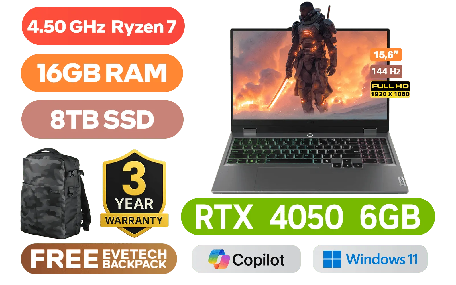 Lenovo LOQ 15ARP9 AMD Ryzen 7 7435HS up to 4.50GHz Processor, 20MB Cache, 8x Cores, 16x Threads / 16GB DDR5 RAM / 8TB Ultra-Fast NVMe SSD / 15.6" FHD (1920x1080) Anti-glare 144Hz IPS-Level Display / NVIDIA GeForce RTX 4050 6GB GDDR6 Dedicated Graphics / Windows 11 Home (64bit) / HD 720p Web Camera With E-Shutter / MediaTek WI-FI 6 Wireless LAN / Bluetooth 5.2 / 3 x USB Type-A / 1 x USB Type-C (USB 10Gbps / USB 3.2 Gen 2), with Lenovo® PD 140W and DisplayPort™ 1.4) / 1 x HDMI 2.1 / 1x Headphone and microphone combo jack / 1x RJ45 / White Backlit Keyboard / 2x 2W Speaker With Nahimic Audio / Free Lenovo LOQ M100 RGB Mouse / Lenovo LOQ Ryzen 7 RTX 4050 Gaming Laptop Gaming Laptop DealLenovo LOQ 15ARP9 AMD Ryzen 7 7435HS up to 4.50GHz Processor, 20MB Cache, 8x Cores, 16x Threads / 16GB DDR5 RAM / 8TB Ultra-Fast NVMe SSD / 15.6" FHD (1920x1080) Anti-glare 144Hz IPS-Level Display / NVIDIA GeForce RTX 4050 6GB GDDR6 Dedicated Graphics / Windows 11 Home (64bit) / HD 720p Web Camera With E-Shutter / MediaTek WI-FI 6 Wireless LAN / Bluetooth 5.2 / 3 x USB Type-A / 1 x USB Type-C (USB 10Gbps / USB 3.2 Gen 2), with Lenovo® PD 140W and DisplayPort™ 1.4) / 1 x HDMI 2.1 / 1x Headphone and microphone combo jack / 1x RJ45 / White Backlit Keyboard / 2x 2W Speaker With Nahimic Audio / Free Lenovo LOQ M100 RGB Mouse / Lenovo LOQ Ryzen 7 RTX 4050 Gaming Laptop Gaming Laptop Deal [83JC00H3SA/8TB] / 3 YEARS WARRANTY / [+] GET FREE EVETECH DASH Premium Gaming Backpack+ FREE DELIVERY !