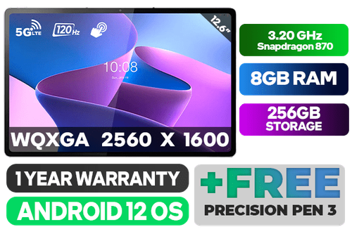 [5G] Lenovo Tab P12 Pro Qualcomm Snapdragon 870 up to 3.20GHz Processor / 8GB LPDDR5 RAM / 256GB On-board Storage / 12.6" WQXGA (2560x1600) HDR10+ AMOLED 120Hz Gorilla Glass 5 Touch Display / Integrated Qualcomm Adreno 650 Graphics / Android 12 Operating System / Fingerprint Reader / Wi-Fi 6E Wireless LAN / Bluetooth 5.2 / 1 x USB Type-C (support data transfer, Power Delivery 3.0 and DisplayPort 1.4) / microSD card / Sim Card slot / 1x Pogo pin connector (4-point) / 2x, Array Microphone / Rear Camera: 13MP autofocus + 5MP wide angle & Front Camera: 8MP fixed focus + TOF Sensor (presence & face detection) / 1 Year Warranty / Free USB-C to Audio Adapter / Free Lenovo Precision Pen 3 / Lenovo Tab P12 Pro AMOLED 120Hz 5G Tablet Deal[5G] Lenovo Tab P12 Pro Qualcomm Snapdragon 870 up to 3.20GHz Processor / 8GB LPDDR5 RAM / 256GB On-board Storage / 12.6" WQXGA (2560x1600) HDR10+ AMOLED 120Hz Gorilla Glass 5 Touch Display / Integrated Qualcomm Adreno 650 Graphics / Android 12 Operating System / Fingerprint Reader / Wi-Fi 6E Wireless LAN / Bluetooth 5.2 / 1 x USB Type-C (support data transfer, Power Delivery 3.0 and DisplayPort 1.4) / microSD card / Sim Card slot / 1x Pogo pin connector (4-point) / 2x, Array Microphone / Rear Camera: 13MP autofocus + 5MP wide angle & Front Camera: 8MP fixed focus + TOF Sensor (presence & face detection) / 1 Year Warranty / Free USB-C to Audio Adapter / Free Lenovo Precision Pen 3 / Lenovo Tab P12 Pro AMOLED 120Hz 5G Tablet Deal [ZA9E0000ZA] + FREE DELIVERY !