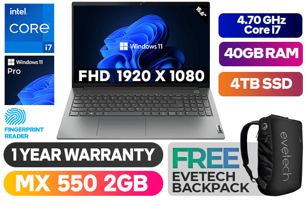 Lenovo ThinkBook 15 G4 IAP 21DJ008DSA 12th Gen Intel Core i7-1255U up to 4.70GHz Processor, 12MB Cache, 10x Cores, 12x Threads / 40GB DDR4 RAM / 4TB Ultra-Fast NVMe SSD / 15.6" FHD (1920x1080) Anti-Glare IPS Display / NVIDIA Geforce MX550 2GB GDDR6 DirectX 12 Dedicated Graphics Card / <span style="font-size: 20px; color: #00BFFF; font-weight: bold;">Windows 11 Professional (64bit)</span> / No DVD Drive Included / Wi-Fi 6 Wireless LAN / Bluetooth 5.1 / 2x USB 3.2 Type-A / 1X USB 3.2 Type-C / 1x USB Type-C support data transfer, Power Delivery 3.0 and DisplayPort™ 1.4 / 1x HDMI / 1x Headphone & Microphone Audio Combo Jack / 1x SD Card reader / HD 720p with Privacy Shutter / 1x RJ-45 / Non-backlight Keyboard / Fingerprint Reader / 1 Year Warranty / Stereo speakers with Dolby® Audio™ / Lenovo ThinkBook 15 G4 Core i7 Professional Laptop DealLenovo ThinkBook 15 G4 IAP 21DJ008DSA 12th Gen Intel Core i7-1255U up to 4.70GHz Processor, 12MB Cache, 10x Cores, 12x Threads / 40GB DDR4 RAM / 4TB Ultra-Fast NVMe SSD / 15.6" FHD (1920x1080) Anti-Glare IPS Display / NVIDIA Geforce MX550 2GB GDDR6 DirectX 12 Dedicated Graphics Card / Windows 11 Professional (64bit) / No DVD Drive Included / Wi-Fi 6 Wireless LAN / Bluetooth 5.1 / 2x USB 3.2 Type-A / 1X USB 3.2 Type-C / 1x USB Type-C support data transfer, Power Delivery 3.0 and DisplayPort™ 1.4 / 1x HDMI / 1x Headphone & Microphone Audio Combo Jack / 1x SD Card reader / HD 720p with Privacy Shutter / 1x RJ-45 / Non-backlight Keyboard / Fingerprint Reader / 1 Year Warranty / Stereo speakers with Dolby® Audio™ / Lenovo ThinkBook 15 G4 Core i7 Professional Laptop Deal [21DJ008DSA/40GB/4TB] / [+] GET FREE EVETECH NEO Premium Gaming Backpack+ FREE DELIVERY !