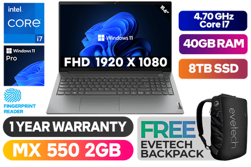 Lenovo ThinkBook 15 G4 IAP 21DJ008DSA 12th Gen Intel Core i7-1255U up to 4.70GHz Processor, 12MB Cache, 10x Cores, 12x Threads / 40GB DDR4 RAM / 8TB Ultra-Fast NVMe SSD / 15.6" FHD (1920x1080) Anti-Glare IPS Display / NVIDIA Geforce MX550 2GB GDDR6 DirectX 12 Dedicated Graphics Card / <span style="font-size: 20px; color: #00BFFF; font-weight: bold;">Windows 11 Professional (64bit)</span> / No DVD Drive Included / Wi-Fi 6 Wireless LAN / Bluetooth 5.1 / 2x USB 3.2 Type-A / 1X USB 3.2 Type-C / 1x USB Type-C support data transfer, Power Delivery 3.0 and DisplayPort™ 1.4 / 1x HDMI / 1x Headphone & Microphone Audio Combo Jack / 1x SD Card reader / HD 720p with Privacy Shutter / 1x RJ-45 / Non-backlight Keyboard / Fingerprint Reader / 1 Year Warranty / Stereo speakers with Dolby® Audio™ / Lenovo ThinkBook 15 G4 Core i7 Professional Laptop DealLenovo ThinkBook 15 G4 IAP 21DJ008DSA 12th Gen Intel Core i7-1255U up to 4.70GHz Processor, 12MB Cache, 10x Cores, 12x Threads / 40GB DDR4 RAM / 8TB Ultra-Fast NVMe SSD / 15.6" FHD (1920x1080) Anti-Glare IPS Display / NVIDIA Geforce MX550 2GB GDDR6 DirectX 12 Dedicated Graphics Card / Windows 11 Professional (64bit) / No DVD Drive Included / Wi-Fi 6 Wireless LAN / Bluetooth 5.1 / 2x USB 3.2 Type-A / 1X USB 3.2 Type-C / 1x USB Type-C support data transfer, Power Delivery 3.0 and DisplayPort™ 1.4 / 1x HDMI / 1x Headphone & Microphone Audio Combo Jack / 1x SD Card reader / HD 720p with Privacy Shutter / 1x RJ-45 / Non-backlight Keyboard / Fingerprint Reader / 1 Year Warranty / Stereo speakers with Dolby® Audio™ / Lenovo ThinkBook 15 G4 Core i7 Professional Laptop Deal [21DJ008DSA/40GB/8TB] / [+] GET FREE EVETECH NEO Premium Gaming Backpack+ FREE DELIVERY !