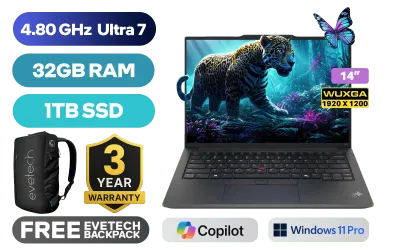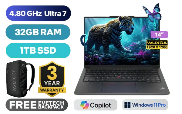 Lenovo ThinkPad E14 Gen 6 Intel Core Ultra 7-155U up to 4.80GHz Processor, 12MB Cache, 12x Cores, 14x Threads / 32GB DDR5 RAM / 1TB Ultra-Fast NVME SSD / 14” WUXGA (1920 x 1200) IPS-Level Display / Integrated Intel Graphics / <span style="font-size: 20px; color: #00BFFF; font-weight: bold;">Windows 11 Professional (64bit)</span> / Intel Wi-Fi 6E AX211 Wireless LAN / Bluetooth 5.3 / 720p HD Camera with Privacy Shutter / 2x USB Type-A / 2x USB Type-C (Supports Thuderbolt 4 / DisplayPort 2.1 / Power Delivery) / 1x HDMI / 1x RJ45 Port / 1x Headphone and Microphone Combo Jack / Kensington Lock / 2x Speakers with Harman Audio / Lenovo ThinkPad E14 G6 Intel Core Ultra 7 Laptop DealLenovo ThinkPad E14 Gen 6 Intel Core Ultra 7-155U up to 4.80GHz Processor, 12MB Cache, 12x Cores, 14x Threads / 32GB DDR5 RAM / 1TB Ultra-Fast NVME SSD / 14” WUXGA (1920 x 1200) IPS-Level Display / Integrated Intel Graphics / Windows 11 Professional (64bit) / Intel Wi-Fi 6E AX211 Wireless LAN / Bluetooth 5.3 / 720p HD Camera with Privacy Shutter / 2x USB Type-A / 2x USB Type-C (Supports Thuderbolt 4 / DisplayPort 2.1 / Power Delivery) / 1x HDMI / 1x RJ45 Port / 1x Headphone and Microphone Combo Jack / Kensington Lock / 2x Speakers with Harman Audio / Lenovo ThinkPad E14 G6 Intel Core Ultra 7 Laptop Deal [21M8SAPD00/32GB/1TB] / [+] GET FREE EVETECH NEO Premium Gaming Backpack / 3 YEARS WARRANTY + FREE DELIVERY !