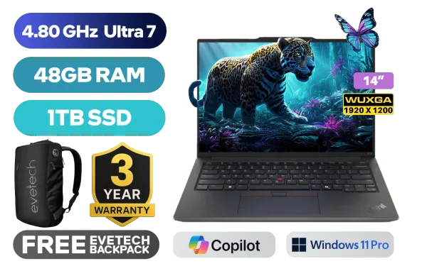 Lenovo ThinkPad E14 Gen 6 Intel Core Ultra 7-155U up to 4.80GHz Processor, 12MB Cache, 12x Cores, 14x Threads / 48GB DDR5 RAM / 1TB Ultra-Fast NVME SSD / 14” WUXGA (1920 x 1200) IPS-Level Display / Integrated Intel Graphics / <span style="font-size: 20px; color: #00BFFF; font-weight: bold;">Windows 11 Professional (64bit)</span> / Intel Wi-Fi 6E AX211 Wireless LAN / Bluetooth 5.3 / 720p HD Camera with Privacy Shutter / 2x USB Type-A / 2x USB Type-C (Supports Thuderbolt 4 / DisplayPort 2.1 / Power Delivery) / 1x HDMI / 1x RJ45 Port / 1x Headphone and Microphone Combo Jack / Kensington Lock / 2x Speakers with Harman Audio / Lenovo ThinkPad E14 G6 Intel Core Ultra 7 Laptop DealLenovo ThinkPad E14 Gen 6 Intel Core Ultra 7-155U up to 4.80GHz Processor, 12MB Cache, 12x Cores, 14x Threads / 48GB DDR5 RAM / 1TB Ultra-Fast NVME SSD / 14” WUXGA (1920 x 1200) IPS-Level Display / Integrated Intel Graphics / Windows 11 Professional (64bit) / Intel Wi-Fi 6E AX211 Wireless LAN / Bluetooth 5.3 / 720p HD Camera with Privacy Shutter / 2x USB Type-A / 2x USB Type-C (Supports Thuderbolt 4 / DisplayPort 2.1 / Power Delivery) / 1x HDMI / 1x RJ45 Port / 1x Headphone and Microphone Combo Jack / Kensington Lock / 2x Speakers with Harman Audio / Lenovo ThinkPad E14 G6 Intel Core Ultra 7 Laptop Deal [21M8SAPD00/48GB/1TB] / [+] GET FREE EVETECH NEO Premium Gaming Backpack / 3 YEARS WARRANTY + FREE DELIVERY !