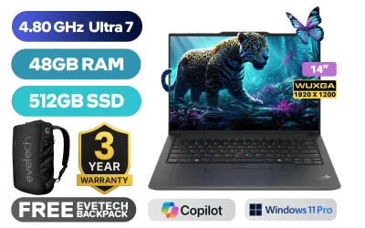 Lenovo ThinkPad E14 Gen 6 Intel Core Ultra 7-155U up to 4.80GHz Processor, 12MB Cache, 12x Cores, 14x Threads / 48GB DDR5 RAM / 512GB Ultra-Fast NVME SSD / 14” WUXGA (1920 x 1200) IPS-Level Display / Integrated Intel Graphics / <span style="font-size: 20px; color: #00BFFF; font-weight: bold;">Windows 11 Professional (64bit)</span> / Intel Wi-Fi 6E AX211 Wireless LAN / Bluetooth 5.3 / 720p HD Camera with Privacy Shutter / 2x USB Type-A / 2x USB Type-C (Supports Thuderbolt 4 / DisplayPort 2.1 / Power Delivery) / 1x HDMI / 1x RJ45 Port / 1x Headphone and Microphone Combo Jack / Kensington Lock / 2x Speakers with Harman Audio / Lenovo ThinkPad E14 G6 Intel Core Ultra 7 Laptop DealLenovo ThinkPad E14 Gen 6 Intel Core Ultra 7-155U up to 4.80GHz Processor, 12MB Cache, 12x Cores, 14x Threads / 48GB DDR5 RAM / 512GB Ultra-Fast NVME SSD / 14” WUXGA (1920 x 1200) IPS-Level Display / Integrated Intel Graphics / Windows 11 Professional (64bit) / Intel Wi-Fi 6E AX211 Wireless LAN / Bluetooth 5.3 / 720p HD Camera with Privacy Shutter / 2x USB Type-A / 2x USB Type-C (Supports Thuderbolt 4 / DisplayPort 2.1 / Power Delivery) / 1x HDMI / 1x RJ45 Port / 1x Headphone and Microphone Combo Jack / Kensington Lock / 2x Speakers with Harman Audio / Lenovo ThinkPad E14 G6 Intel Core Ultra 7 Laptop Deal [21M8SAPD00/48GB] / [+] GET FREE EVETECH NEO Premium Gaming Backpack / 3 YEARS WARRANTY + FREE DELIVERY !