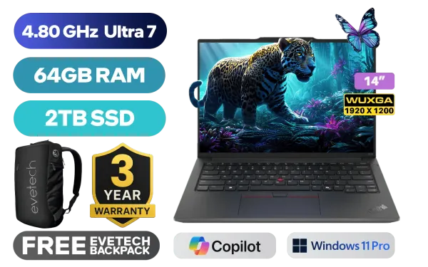 Lenovo ThinkPad E14 Gen 6 Intel Core Ultra 7-155U up to 4.80GHz Processor, 12MB Cache, 12x Cores, 14x Threads / 64GB DDR5 RAM / 2TB Ultra-Fast NVME SSD / 14” WUXGA (1920 x 1200) IPS-Level Display / Integrated Intel Graphics / <span style="font-size: 20px; color: #00BFFF; font-weight: bold;">Windows 11 Professional (64bit)</span> / Intel Wi-Fi 6E AX211 Wireless LAN / Bluetooth 5.3 / 720p HD Camera with Privacy Shutter / 2x USB Type-A / 2x USB Type-C (Supports Thuderbolt 4 / DisplayPort 2.1 / Power Delivery) / 1x HDMI / 1x RJ45 Port / 1x Headphone and Microphone Combo Jack / Kensington Lock / 2x Speakers with Harman Audio / Lenovo ThinkPad E14 G6 Intel Core Ultra 7 Laptop DealLenovo ThinkPad E14 Gen 6 Intel Core Ultra 7-155U up to 4.80GHz Processor, 12MB Cache, 12x Cores, 14x Threads / 64GB DDR5 RAM / 2TB Ultra-Fast NVME SSD / 14” WUXGA (1920 x 1200) IPS-Level Display / Integrated Intel Graphics / Windows 11 Professional (64bit) / Intel Wi-Fi 6E AX211 Wireless LAN / Bluetooth 5.3 / 720p HD Camera with Privacy Shutter / 2x USB Type-A / 2x USB Type-C (Supports Thuderbolt 4 / DisplayPort 2.1 / Power Delivery) / 1x HDMI / 1x RJ45 Port / 1x Headphone and Microphone Combo Jack / Kensington Lock / 2x Speakers with Harman Audio / Lenovo ThinkPad E14 G6 Intel Core Ultra 7 Laptop Deal [21M8SAPD00/64GB/2TB] / [+] GET FREE EVETECH NEO Premium Gaming Backpack / 3 YEARS WARRANTY + FREE DELIVERY !