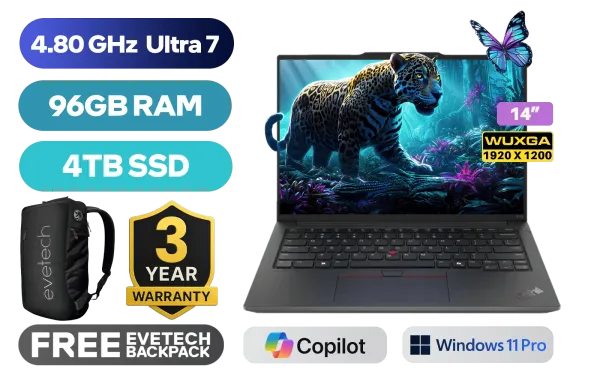 Lenovo ThinkPad E14 Gen 6 Intel Core Ultra 7-155U up to 4.80GHz Processor, 12MB Cache, 12x Cores, 14x Threads / 96GB DDR5 RAM / 4TB Ultra-Fast NVME SSD / 14” WUXGA (1920 x 1200) IPS-Level Display / Integrated Intel Graphics / <span style="font-size: 20px; color: #00BFFF; font-weight: bold;">Windows 11 Professional (64bit)</span> / Intel Wi-Fi 6E AX211 Wireless LAN / Bluetooth 5.3 / 720p HD Camera with Privacy Shutter / 2x USB Type-A / 2x USB Type-C (Supports Thuderbolt 4 / DisplayPort 2.1 / Power Delivery) / 1x HDMI / 1x RJ45 Port / 1x Headphone and Microphone Combo Jack / Kensington Lock / 2x Speakers with Harman Audio / Lenovo ThinkPad E14 G6 Intel Core Ultra 7 Laptop DealLenovo ThinkPad E14 Gen 6 Intel Core Ultra 7-155U up to 4.80GHz Processor, 12MB Cache, 12x Cores, 14x Threads / 96GB DDR5 RAM / 4TB Ultra-Fast NVME SSD / 14” WUXGA (1920 x 1200) IPS-Level Display / Integrated Intel Graphics / Windows 11 Professional (64bit) / Intel Wi-Fi 6E AX211 Wireless LAN / Bluetooth 5.3 / 720p HD Camera with Privacy Shutter / 2x USB Type-A / 2x USB Type-C (Supports Thuderbolt 4 / DisplayPort 2.1 / Power Delivery) / 1x HDMI / 1x RJ45 Port / 1x Headphone and Microphone Combo Jack / Kensington Lock / 2x Speakers with Harman Audio / Lenovo ThinkPad E14 G6 Intel Core Ultra 7 Laptop Deal [21M8SAPD00/96GB/4TB] / [+] GET FREE EVETECH NEO Premium Gaming Backpack / 3 YEARS WARRANTY + FREE DELIVERY !