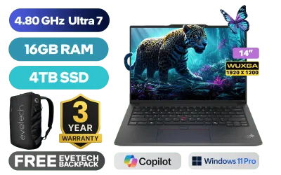 Lenovo ThinkPad E14 Gen 6 Intel Core Ultra 7-155U up to 4.80GHz Processor, 12MB Cache, 12x Cores, 14x Threads / 16GB DDR5 RAM / 4TB Ultra-Fast NVME SSD / 14” WUXGA (1920 x 1200) IPS-Level Display / Integrated Intel Graphics / <span style="font-size: 20px; color: #00BFFF; font-weight: bold;">Windows 11 Professional (64bit)</span> / Intel Wi-Fi 6E AX211 Wireless LAN / Bluetooth 5.3 / 720p HD Camera with Privacy Shutter / 2x USB Type-A / 2x USB Type-C (Supports Thuderbolt 4 / DisplayPort 2.1 / Power Delivery) / 1x HDMI / 1x RJ45 Port / 1x Headphone and Microphone Combo Jack / Kensington Lock / 2x Speakers with Harman Audio / Lenovo ThinkPad E14 G6 Intel Core Ultra 7 Laptop DealLenovo ThinkPad E14 Gen 6 Intel Core Ultra 7-155U up to 4.80GHz Processor, 12MB Cache, 12x Cores, 14x Threads / 16GB DDR5 RAM / 4TB Ultra-Fast NVME SSD / 14” WUXGA (1920 x 1200) IPS-Level Display / Integrated Intel Graphics / Windows 11 Professional (64bit) / Intel Wi-Fi 6E AX211 Wireless LAN / Bluetooth 5.3 / 720p HD Camera with Privacy Shutter / 2x USB Type-A / 2x USB Type-C (Supports Thuderbolt 4 / DisplayPort 2.1 / Power Delivery) / 1x HDMI / 1x RJ45 Port / 1x Headphone and Microphone Combo Jack / Kensington Lock / 2x Speakers with Harman Audio / Lenovo ThinkPad E14 G6 Intel Core Ultra 7 Laptop Deal [21M8SAPD00/4TB] / [+] GET FREE EVETECH NEO Premium Gaming Backpack / 3 YEARS WARRANTY + FREE DELIVERY !